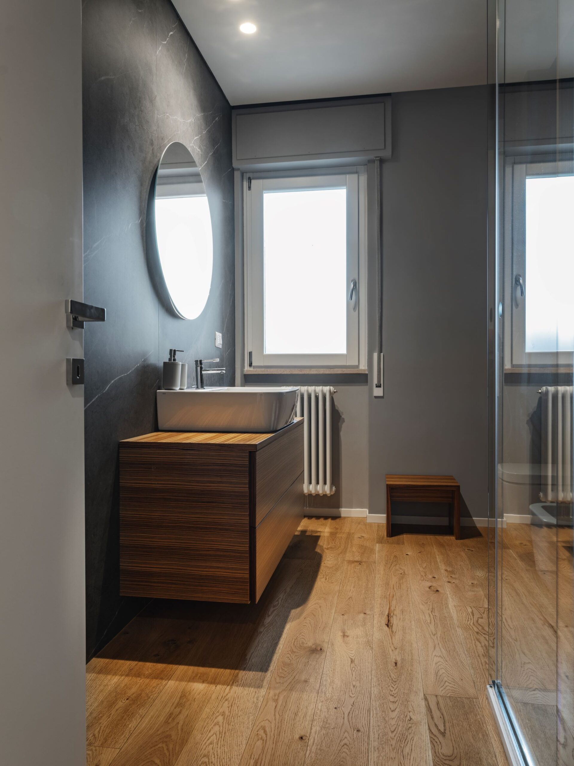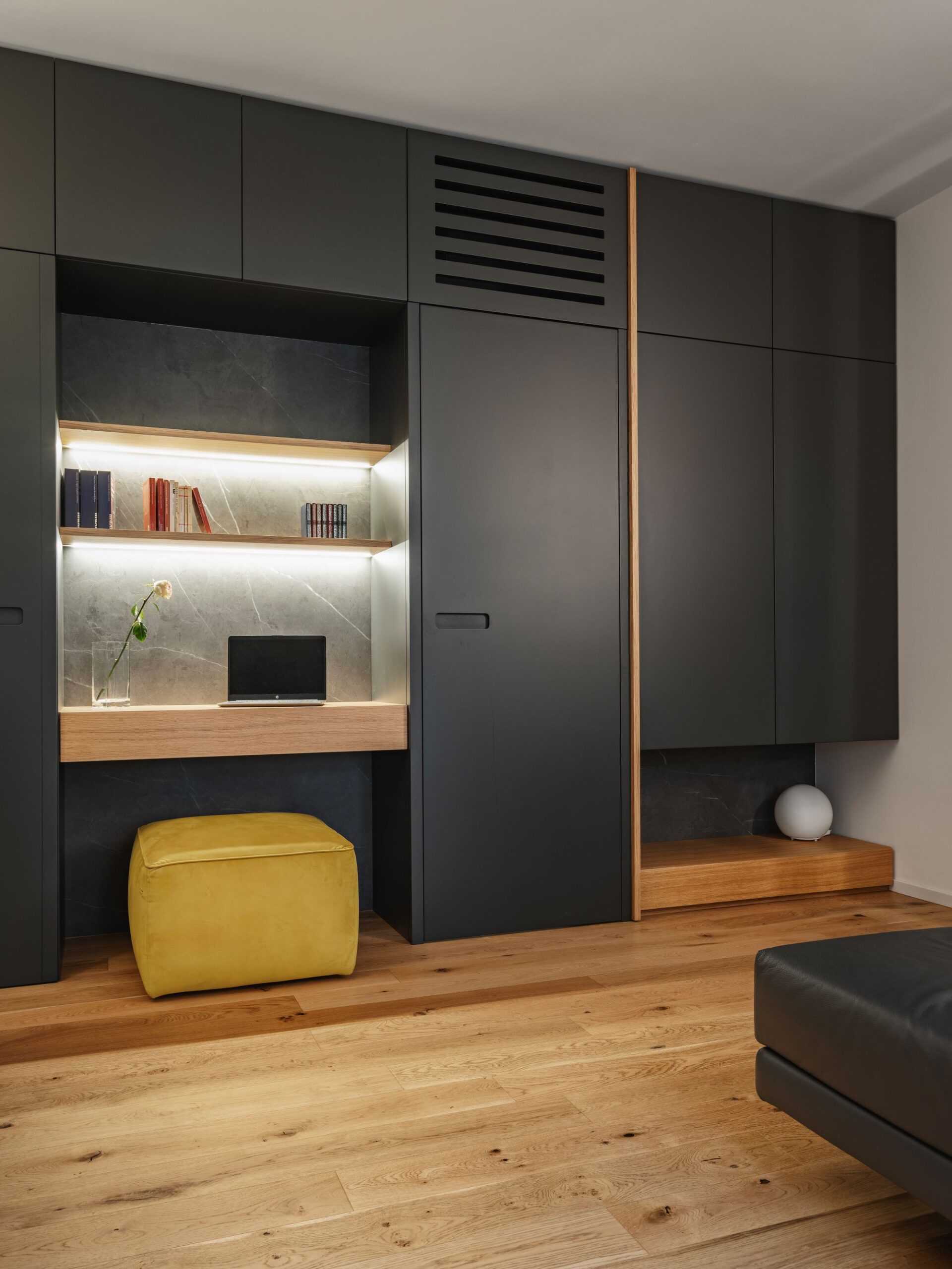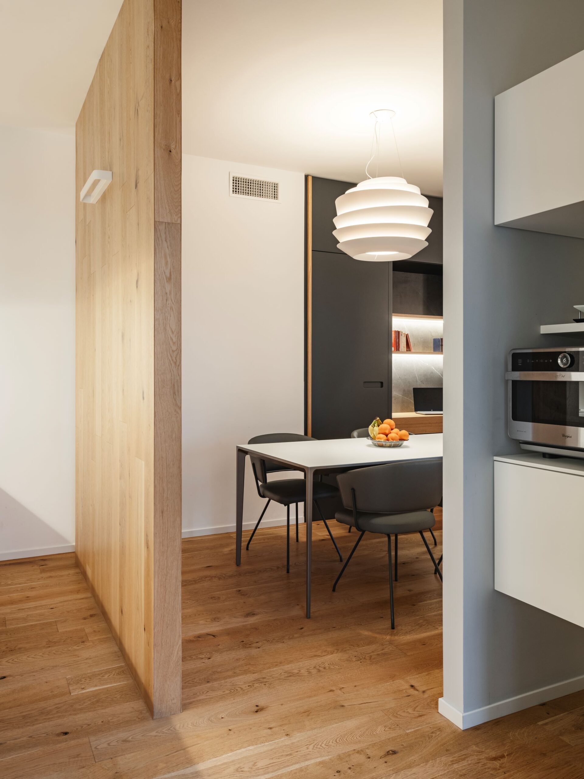 La zona giorno non ha porte, un volume scuro di un grigio intense laccato, realizzato su misura, comunica con la zona notte e diventa al contempo guardaroba, scrittoio, libreria e dispensa.