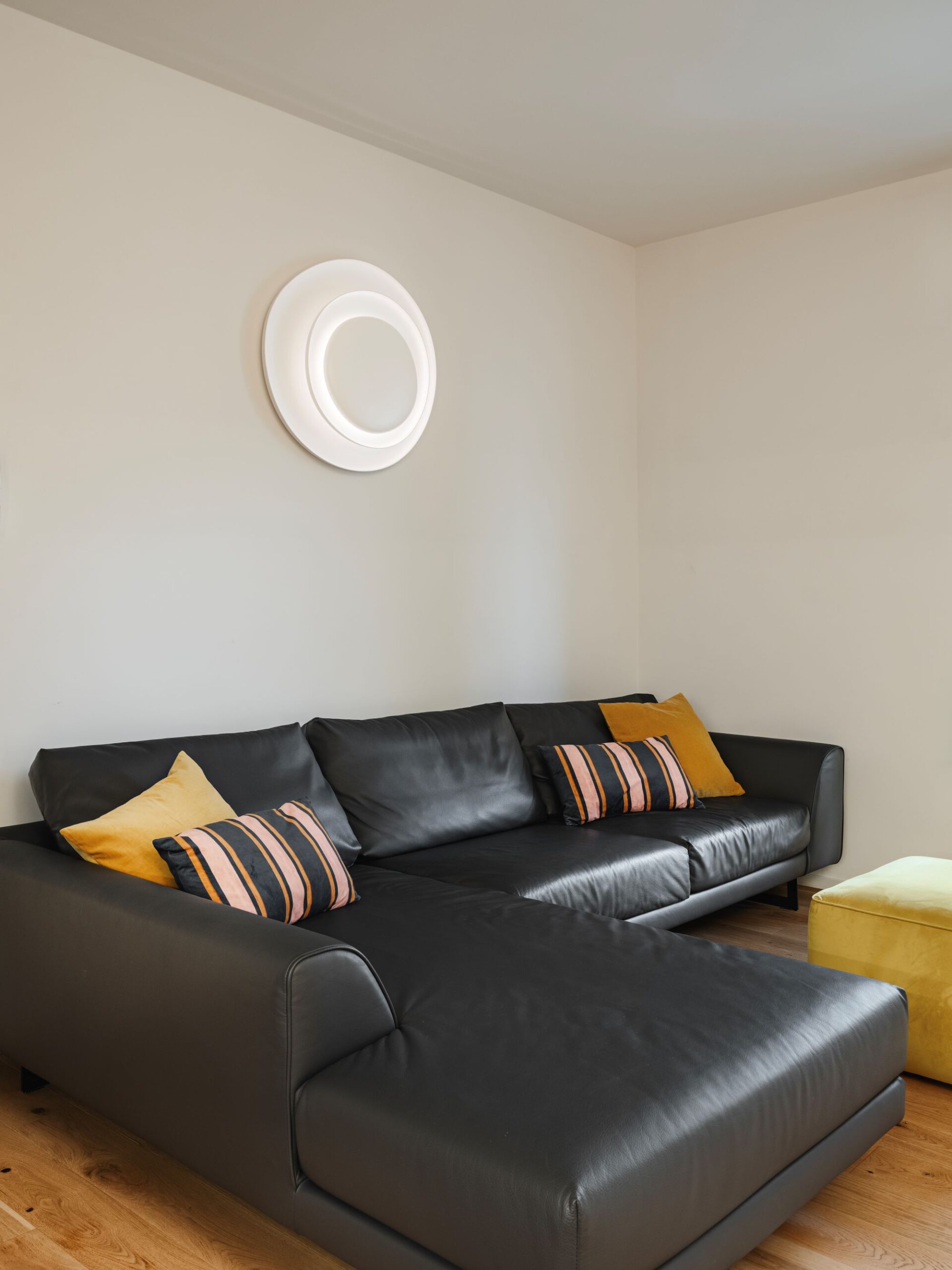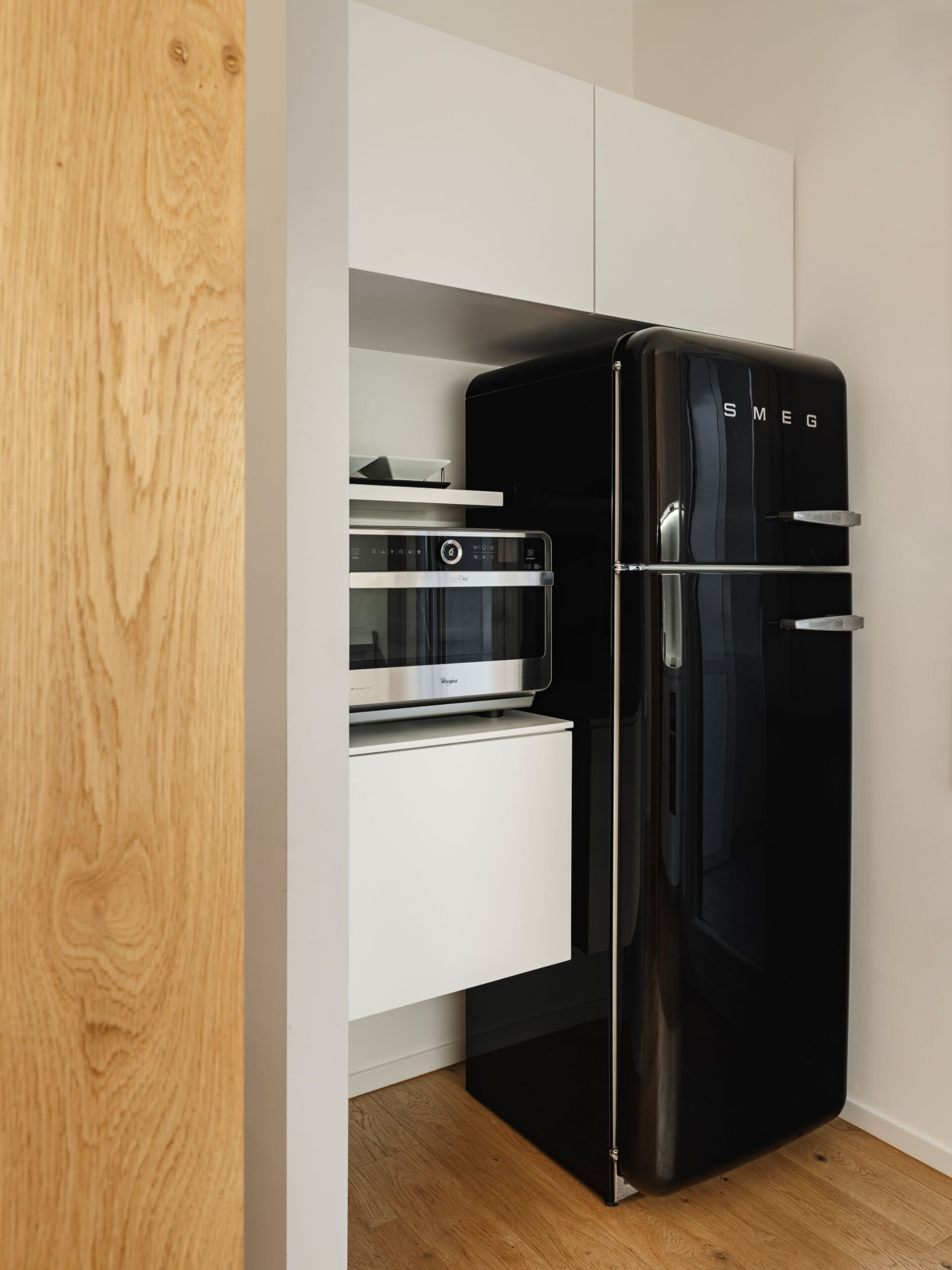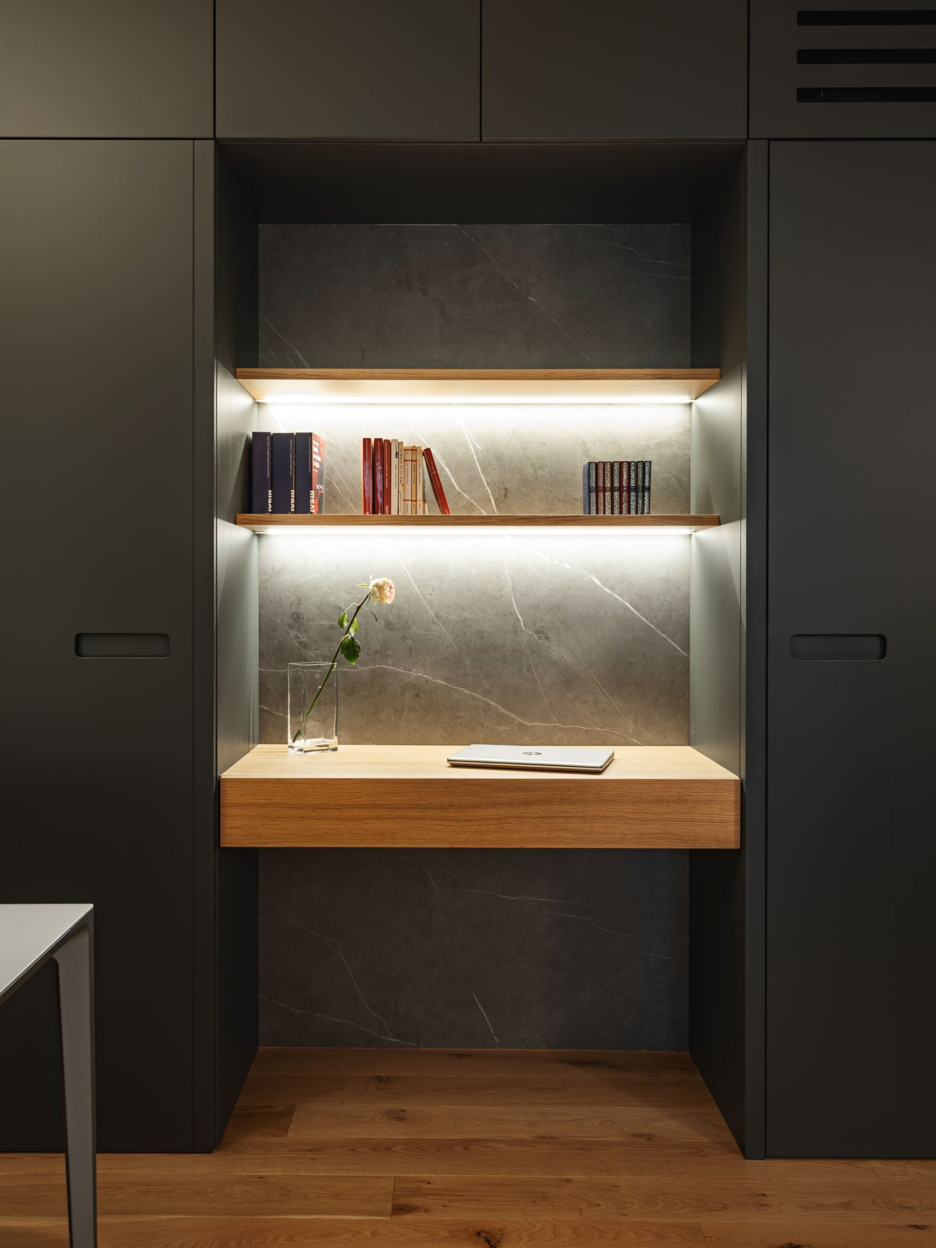 La zona giorno non ha porte, un volume scuro di un grigio intense laccato, realizzato su misura, comunica con la zona notte e diventa al contempo guardaroba, scrittoio, libreria e dispensa.