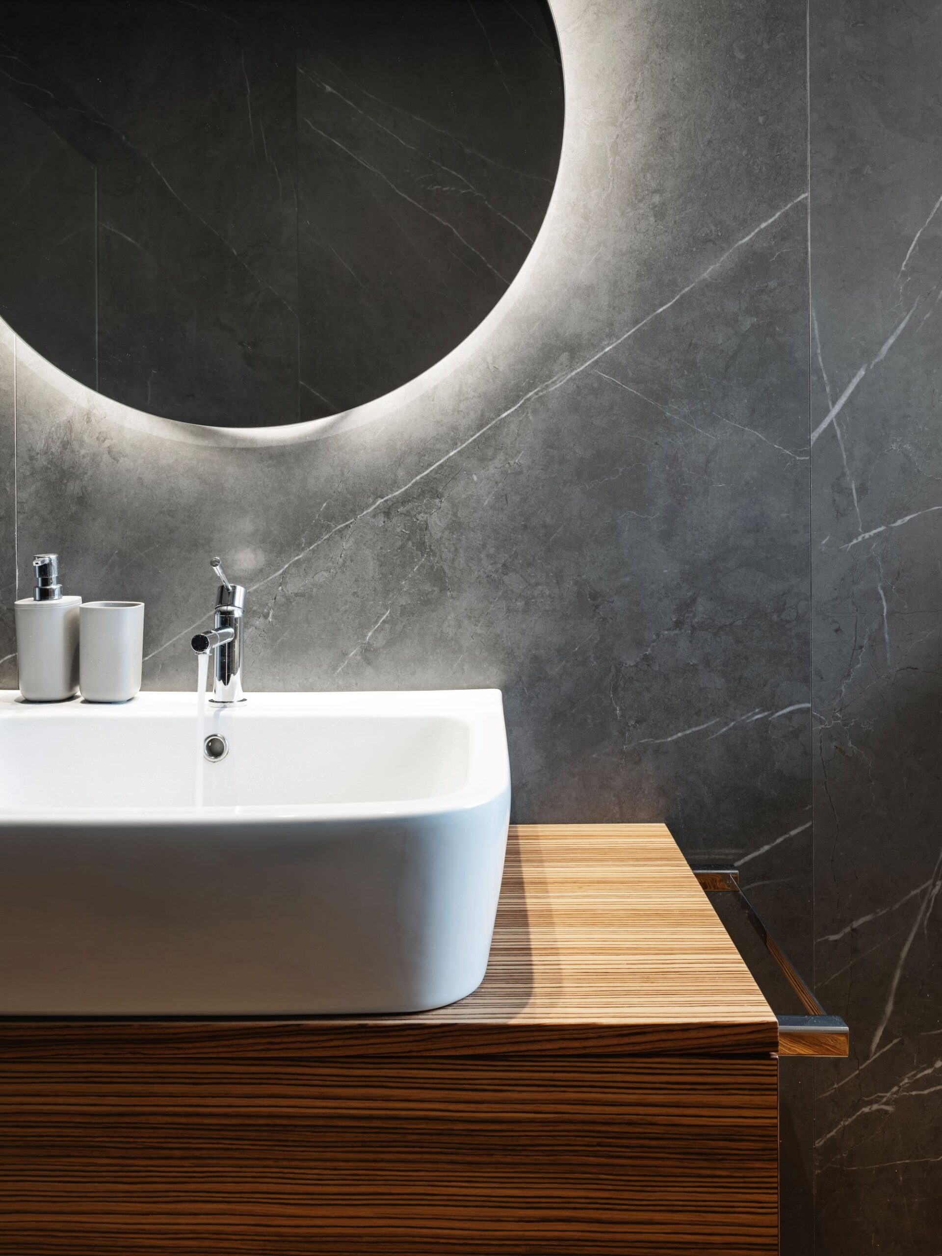 Le geometrie pulite ed essenziali e la mescolanza di colori e materiali diversi: dal laccato grigio, al rovere naturale fino agli inserti in pietra lavica, conferiscono agli ambienti uno stile fresco e contemporaneo.