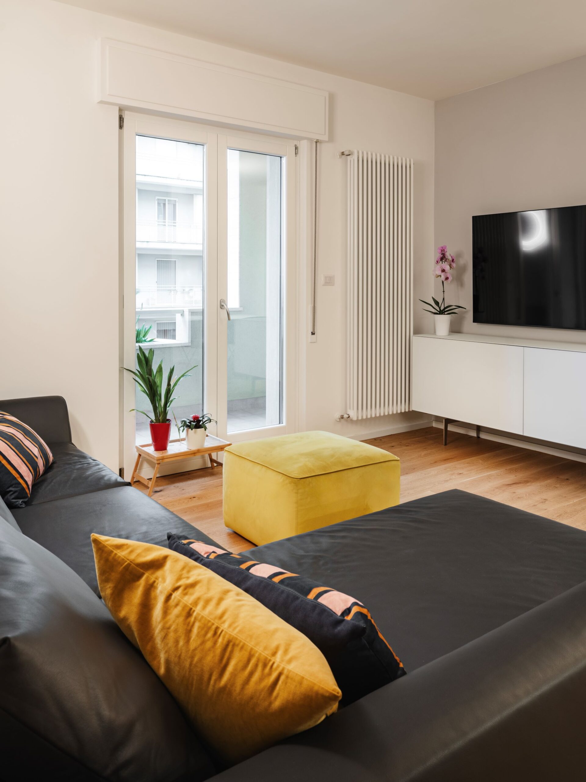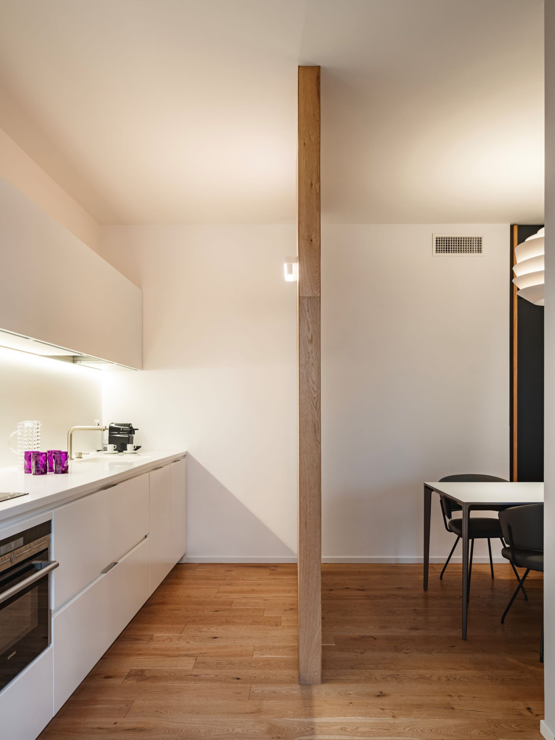 Sono stati abbattuti i vecchi tramezzi per ottenere uno spazio fluido in cui living, soggiorno e cucina si fondono pur rimanendo distinti.