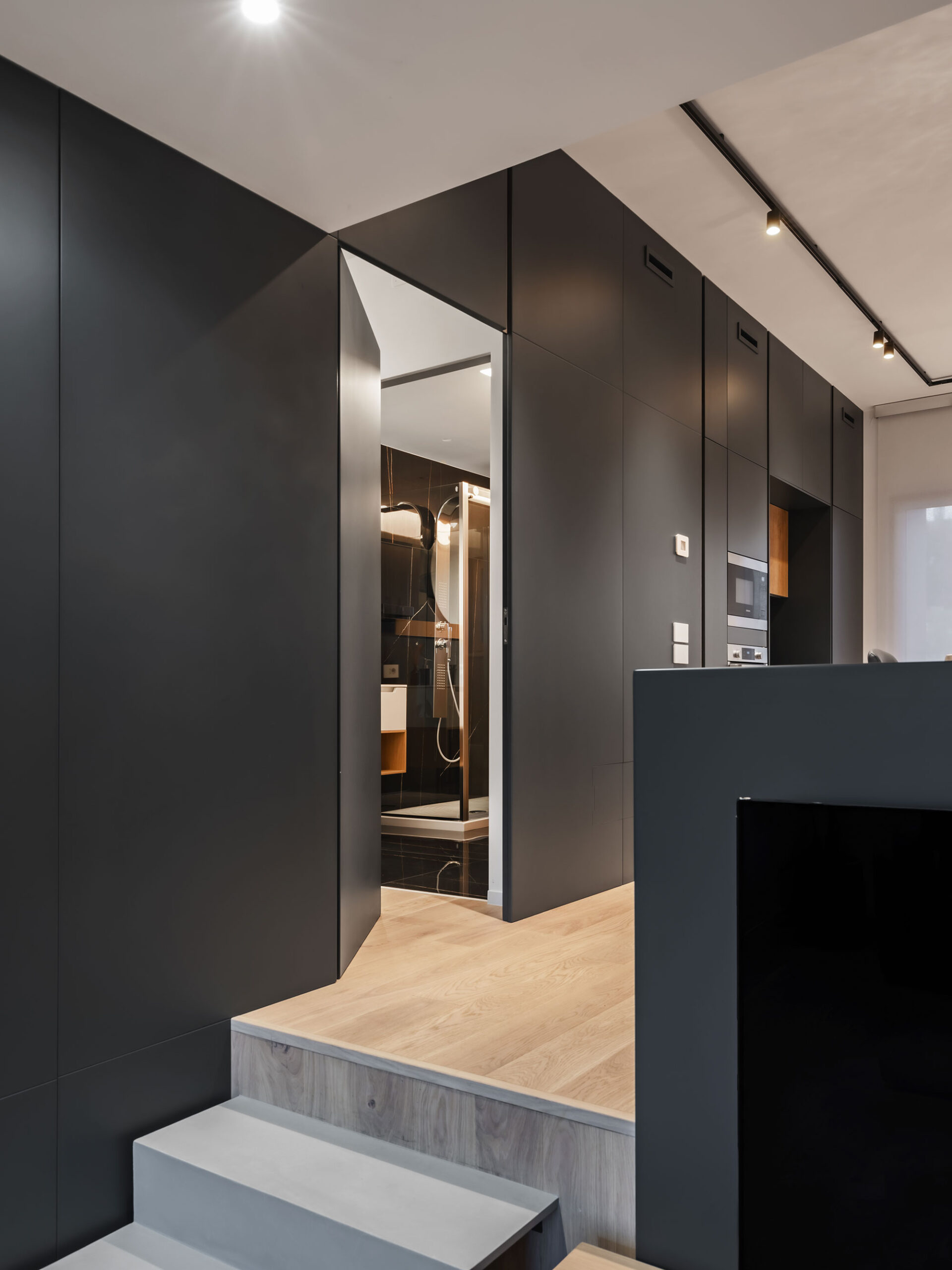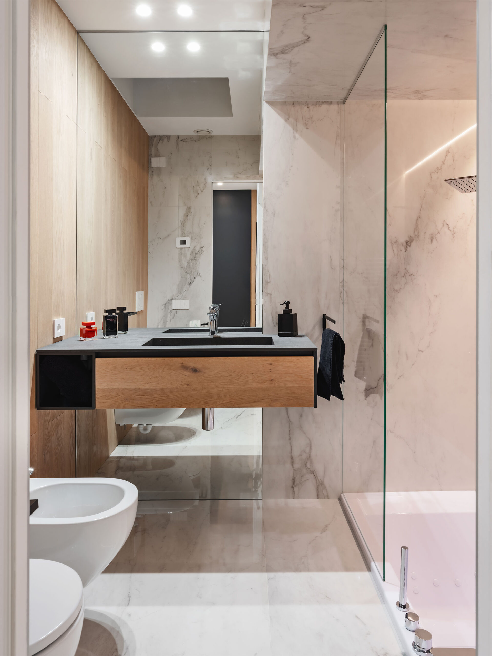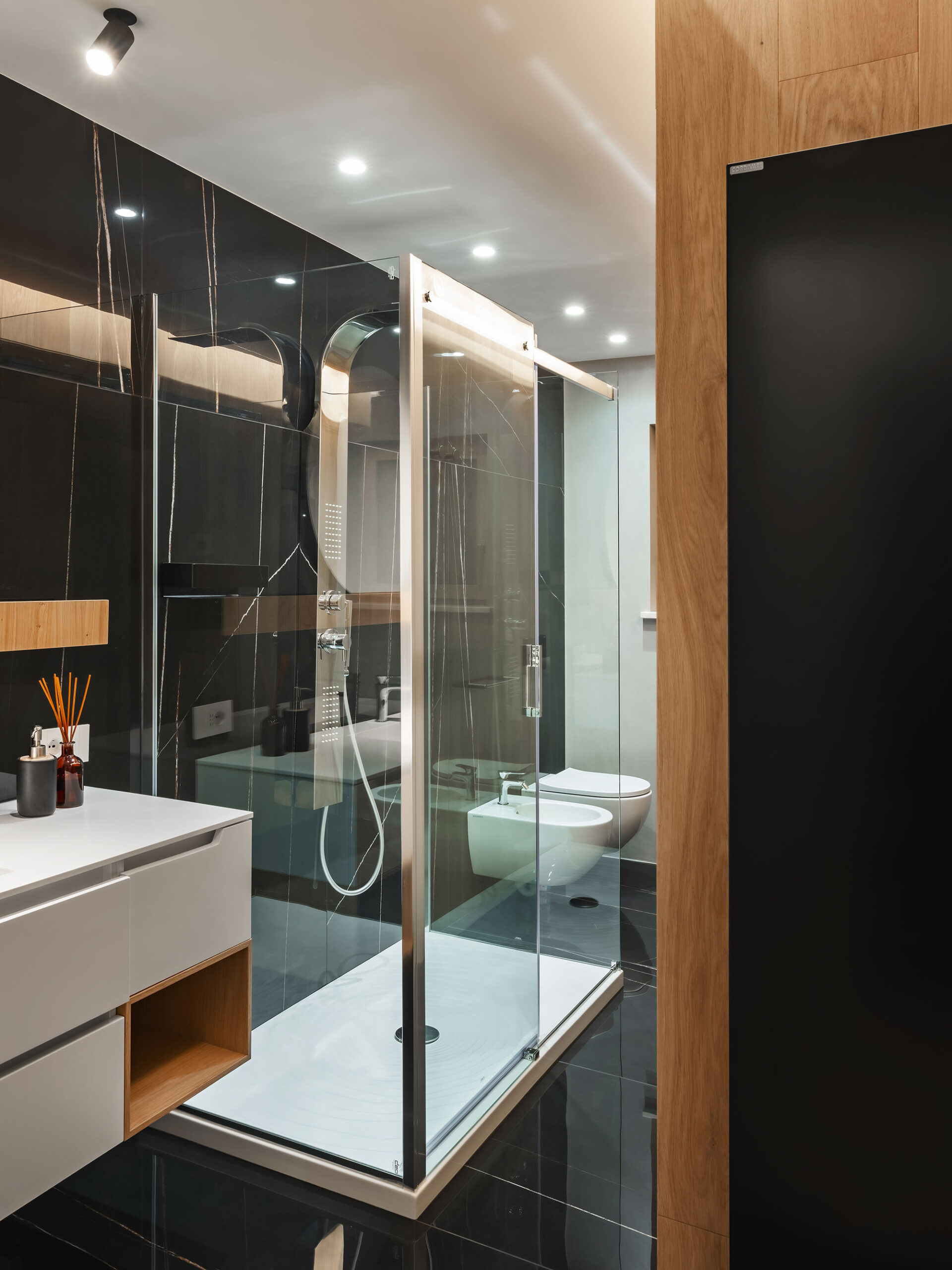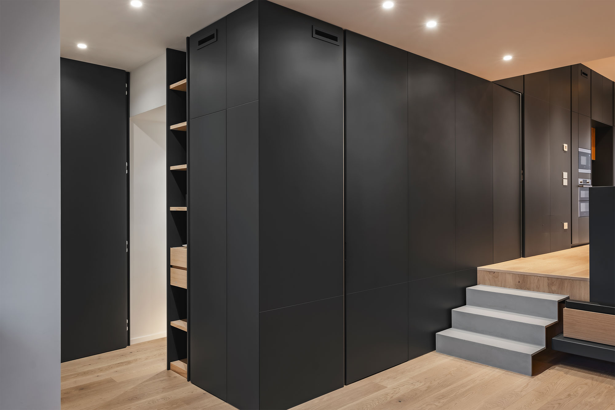 Contrasti netti, rovere / nero e geometrie rigorose lasciano poco spazio all’indeterminato e all’incerto. Tutti gli ambienti sono ricavati da una sequenza e sovrapposizione di armadi contenitori, contenenti e contenuti, che non solo organizzano gli aspetti funzionali della vita ma la contengono, ricavandone bagni, stanze, cucina e altri locali in una chiara e rassicurante successione.