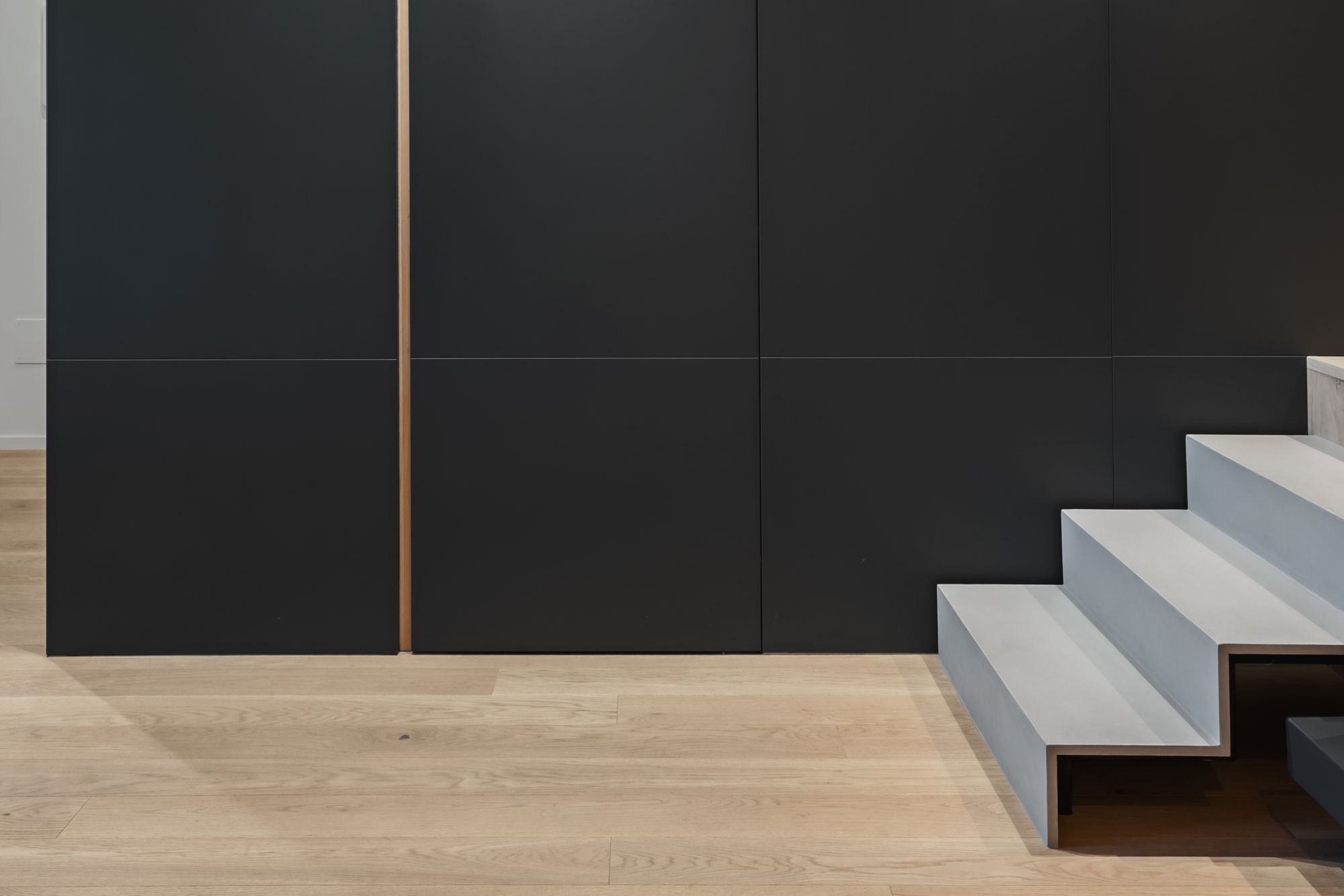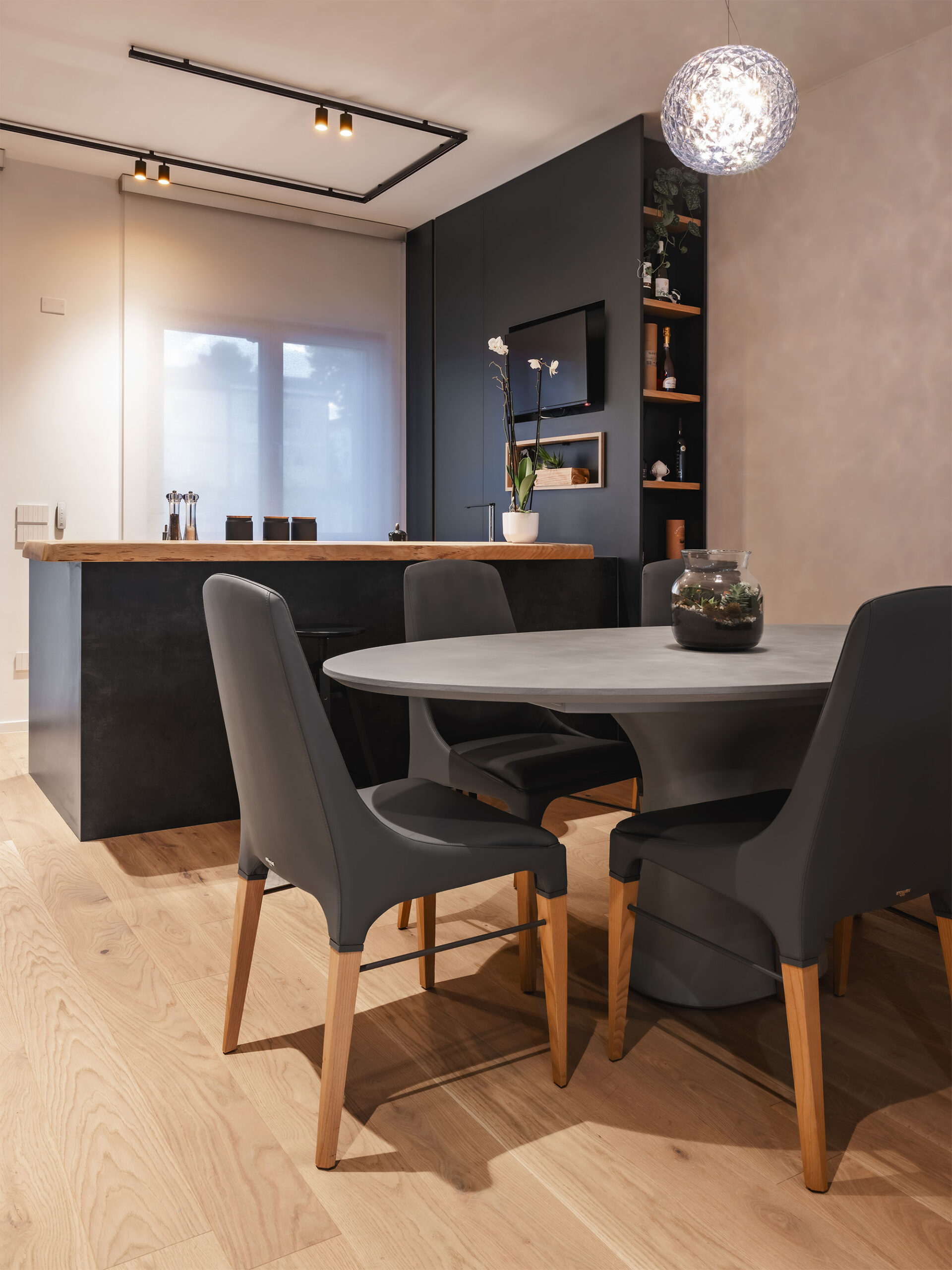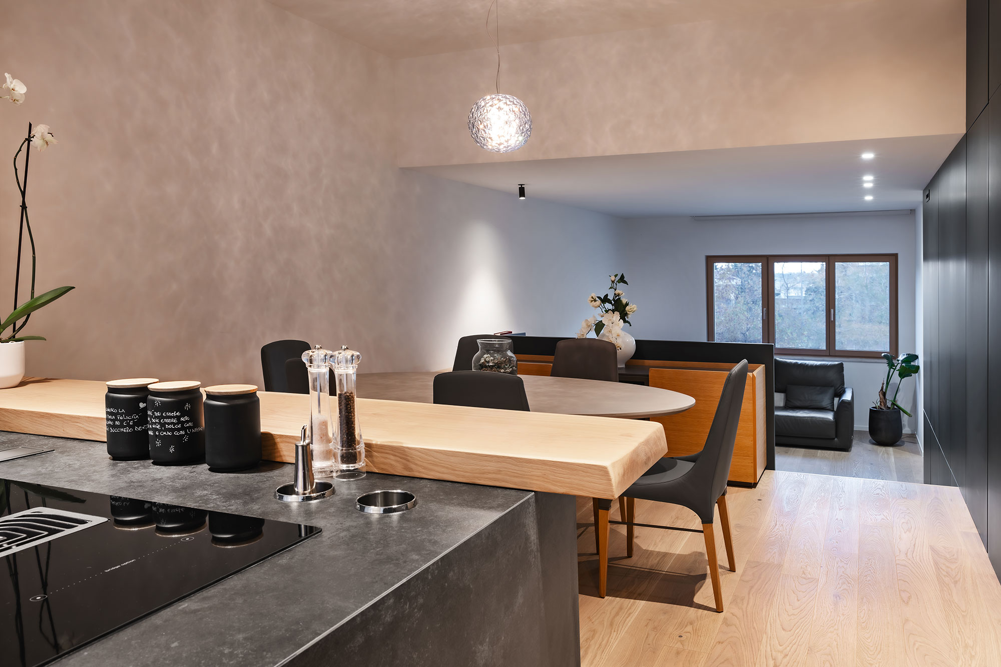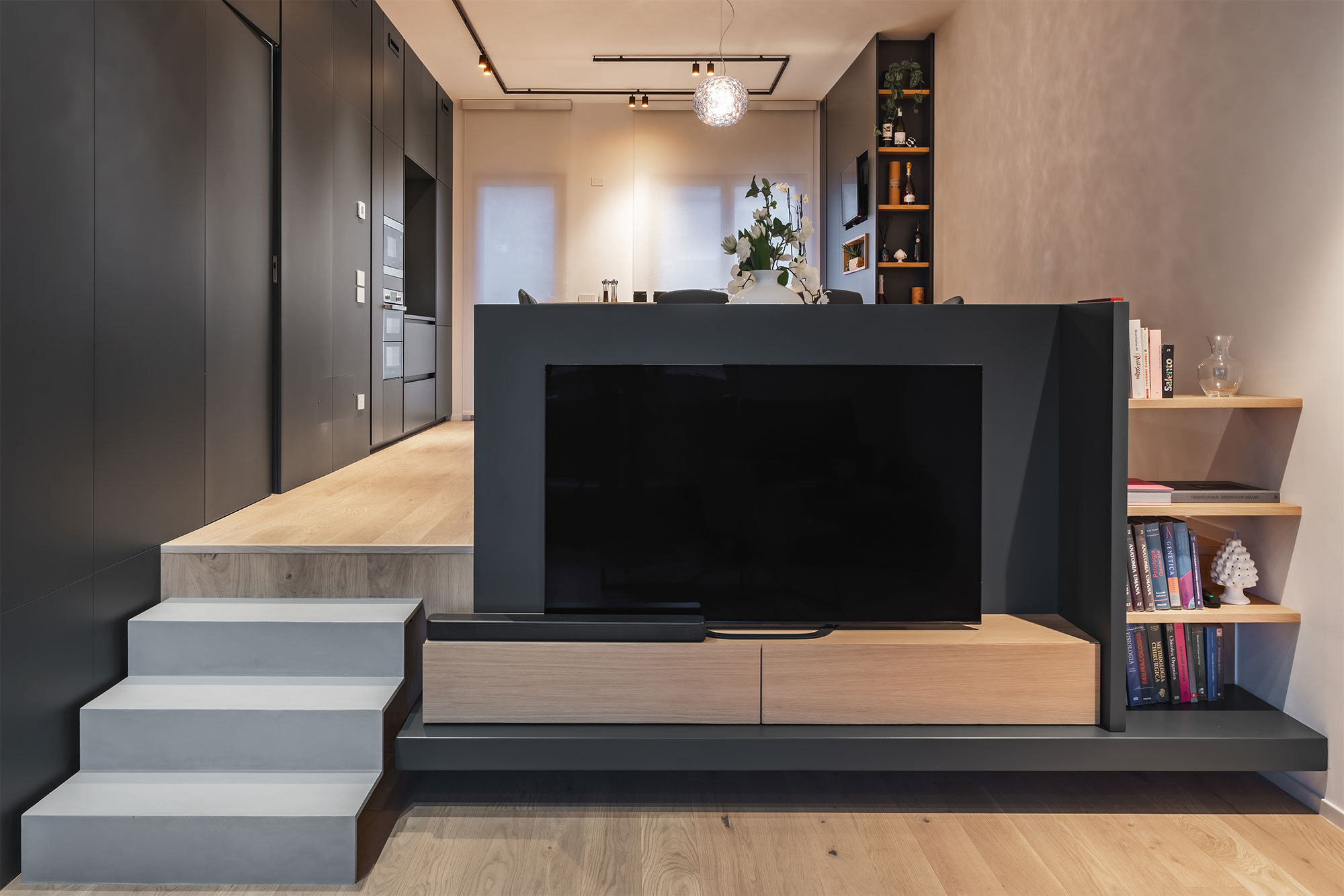 Contrasti netti, rovere / nero e geometrie rigorose lasciano poco spazio all’indeterminato e all’incerto. Tutti gli ambienti sono ricavati da una sequenza e sovrapposizione di armadi contenitori, contenenti e contenuti, che non solo organizzano gli aspetti funzionali della vita ma la contengono, ricavandone bagni, stanze, cucina e altri locali in una chiara e rassicurante successione.