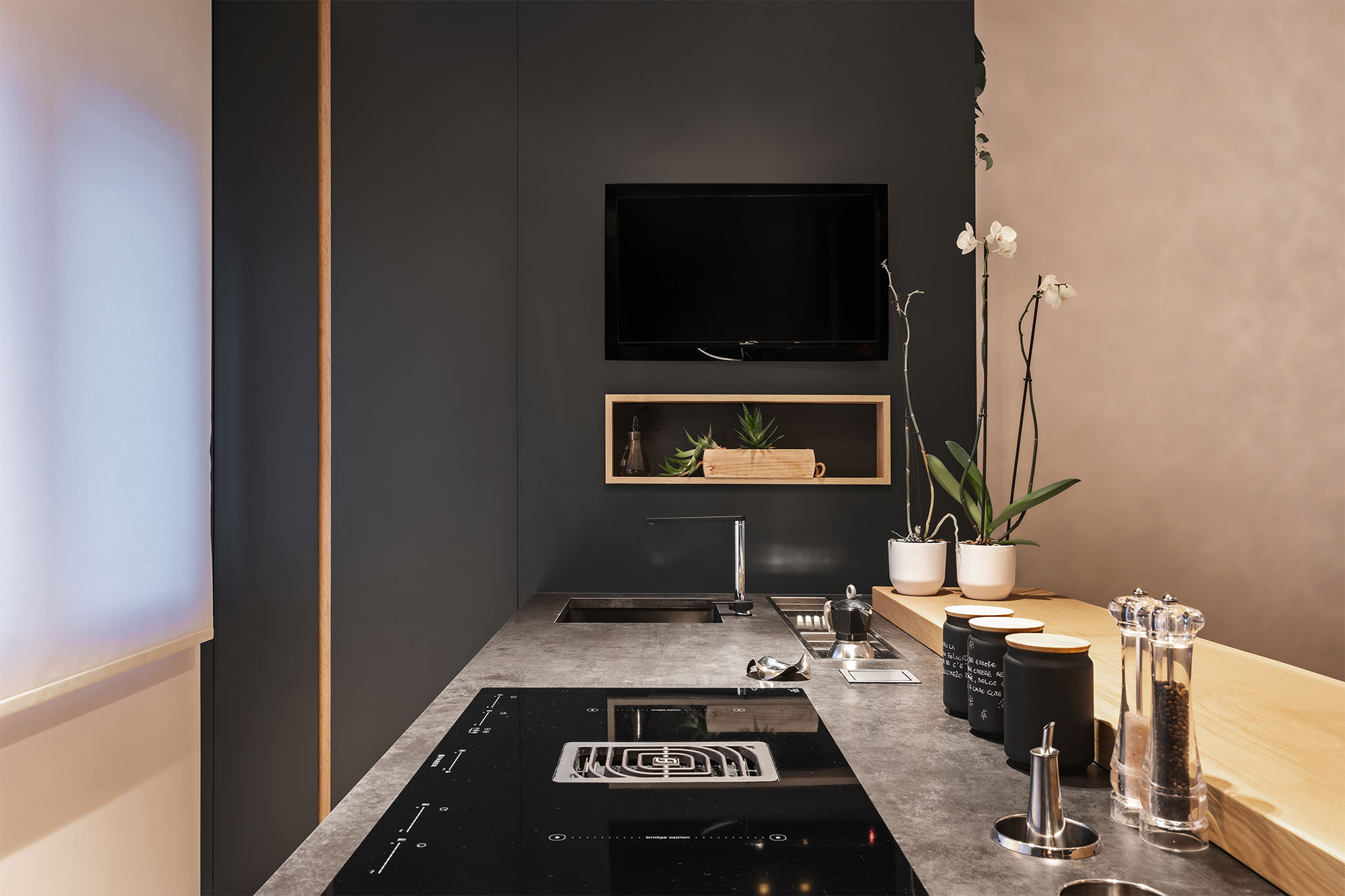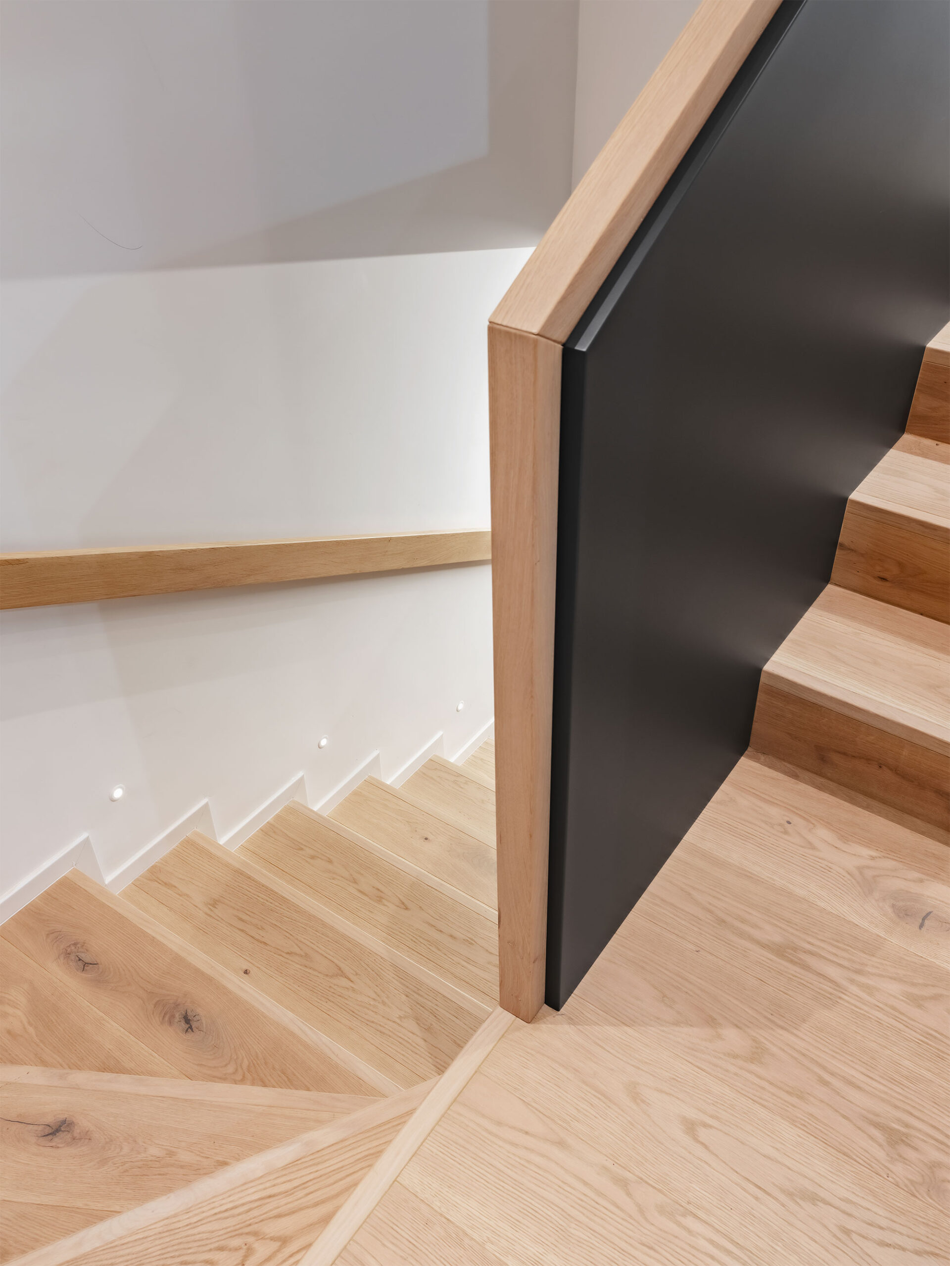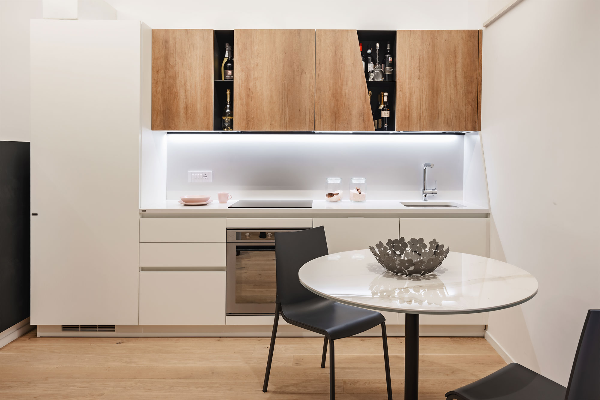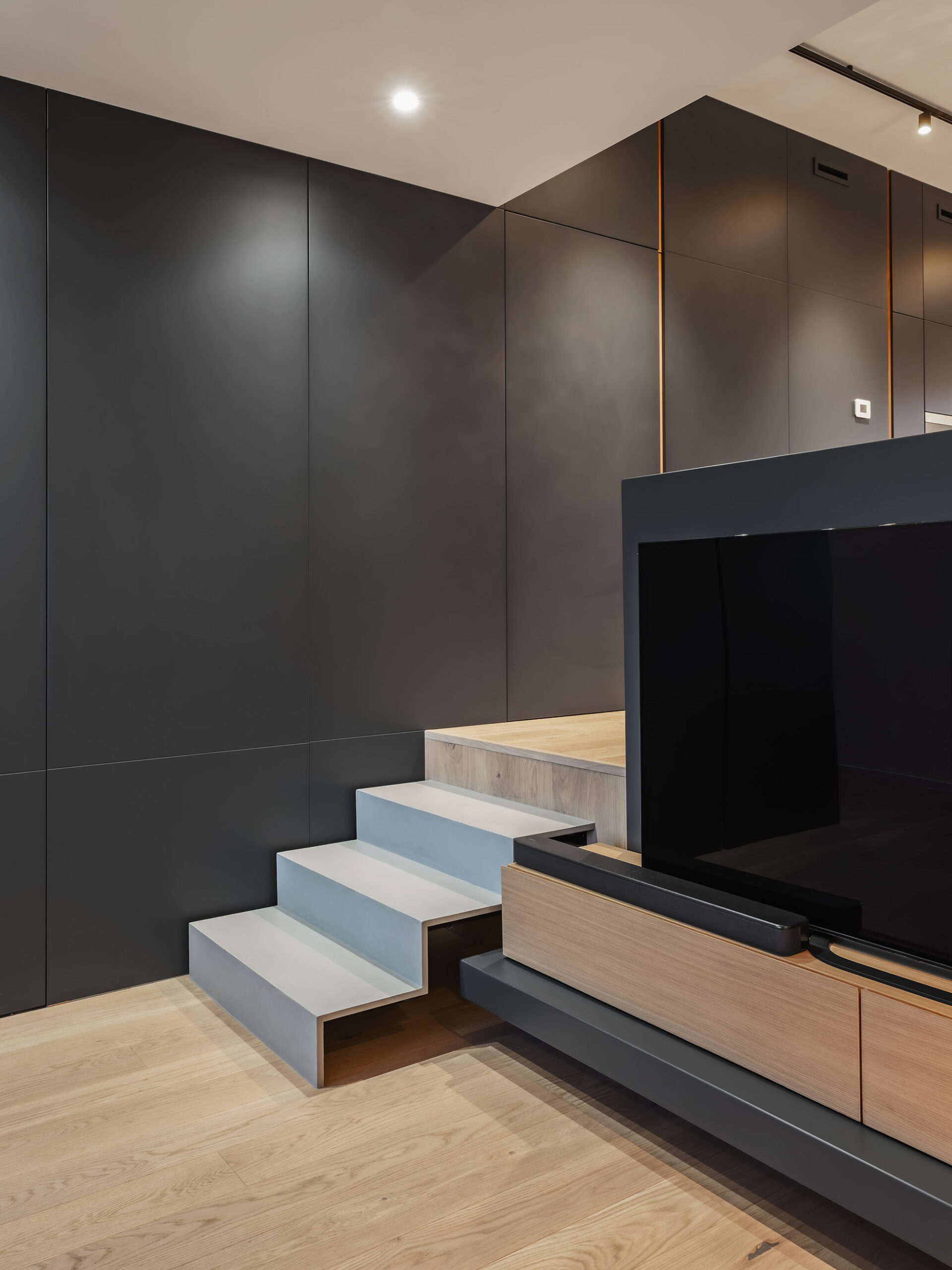Contrasti netti, rovere / nero e geometrie rigorose lasciano poco spazio all’indeterminato e all’incerto. Tutti gli ambienti sono ricavati da una sequenza e sovrapposizione di armadi contenitori, contenenti e contenuti, che non solo organizzano gli aspetti funzionali della vita ma la contengono, ricavandone bagni, stanze, cucina e altri locali in una chiara e rassicurante successione.