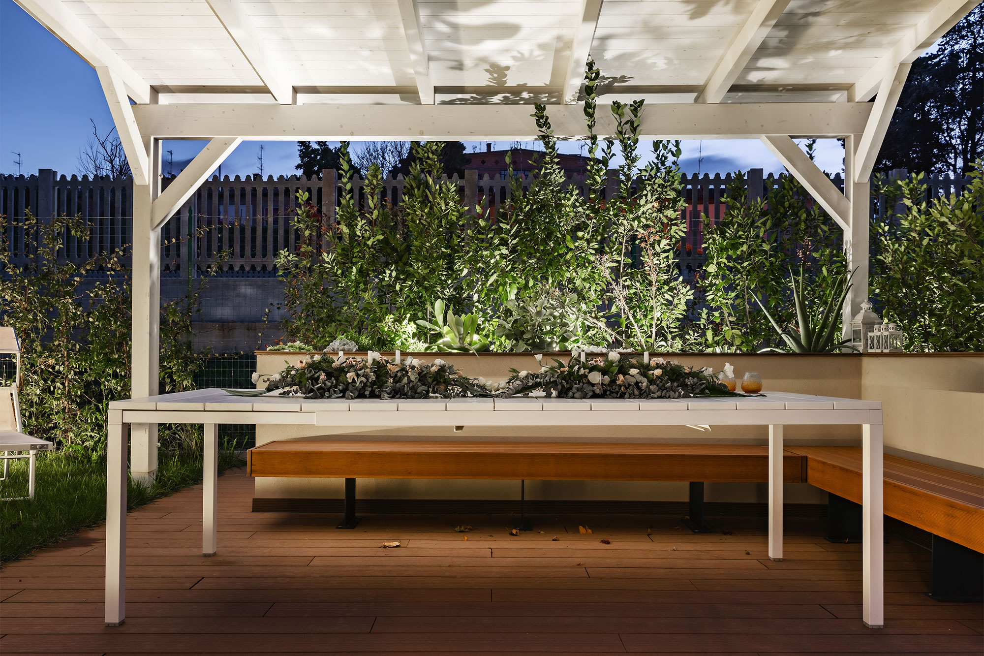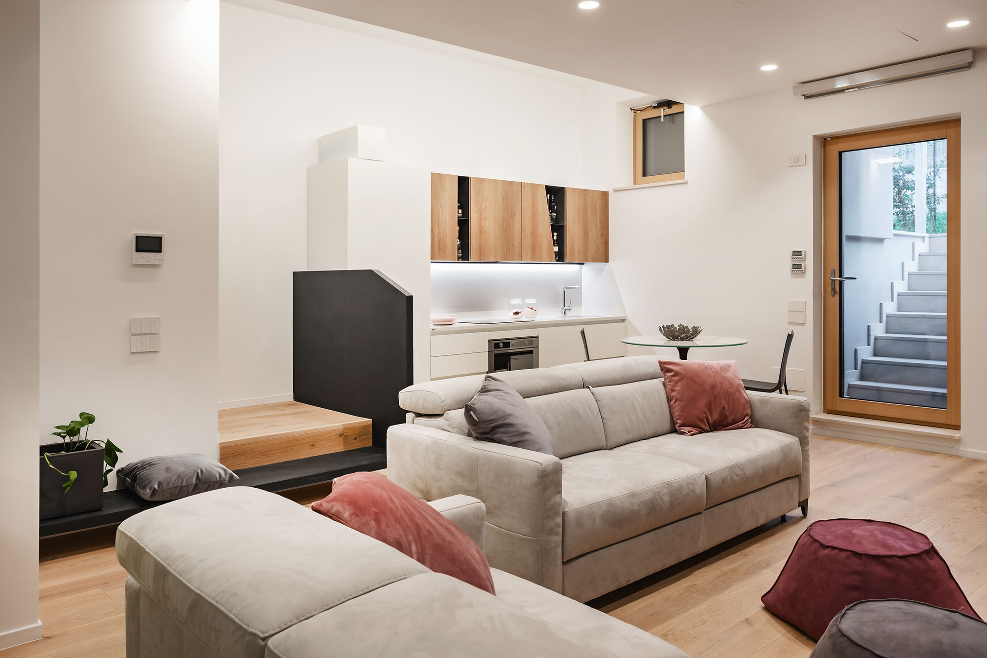 Geometrie pulite ed essenziali, pareti in legno laccato disegnate su misura delineano lo spazio luminoso ed espansivo di un’abitazione distribuita su tre livelli con giardino privato annesso. In accordo con il cliente, al progettista risulta evidente la necessità di introdurre un open space nella zona giorno distribuita su due quote differenti. Arredi bassi e contenitivi, separano la zona salotto dalla zona pranzo lasciando permeare la luce e lo spazio senza alterarne i volumi.