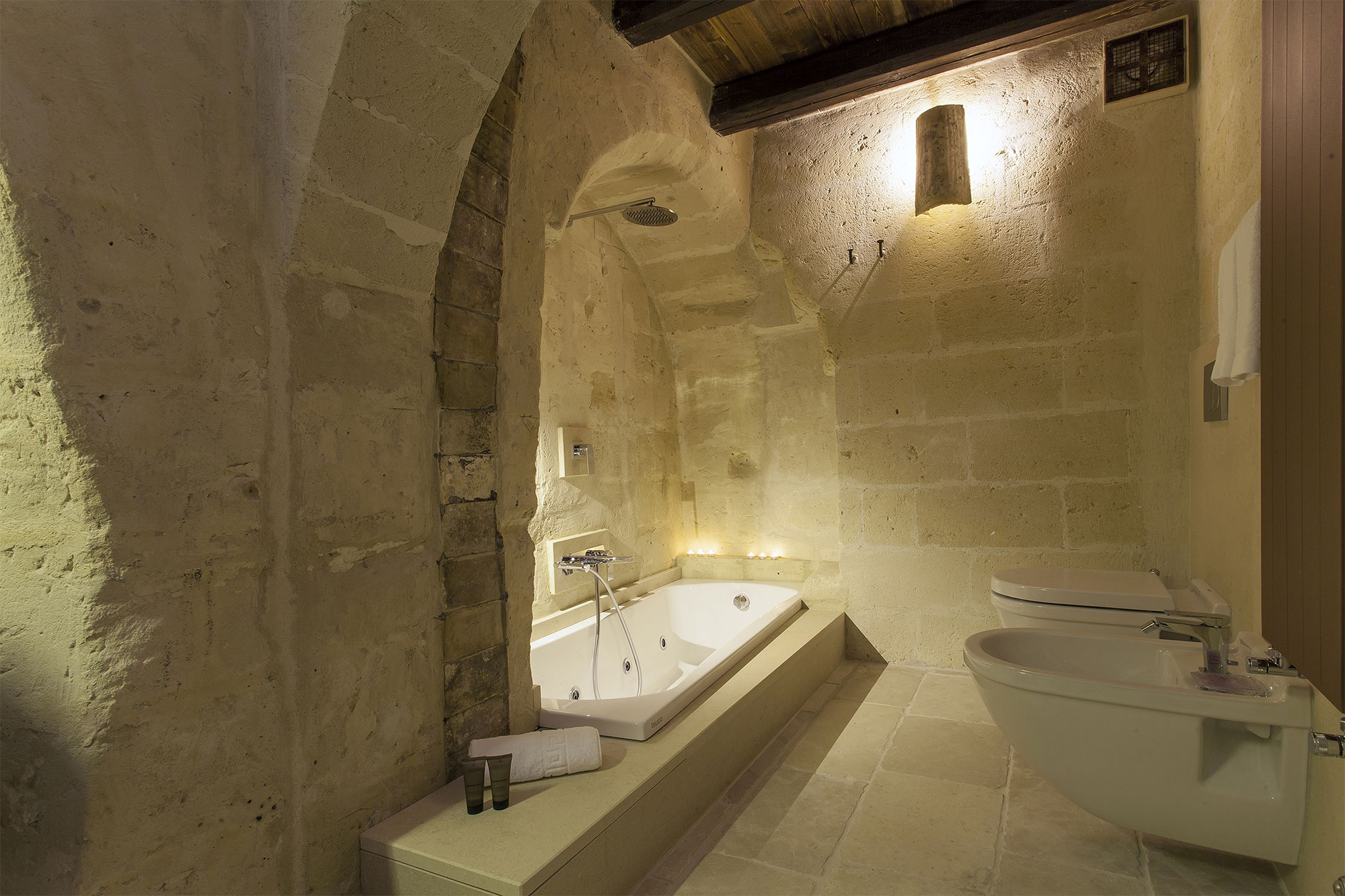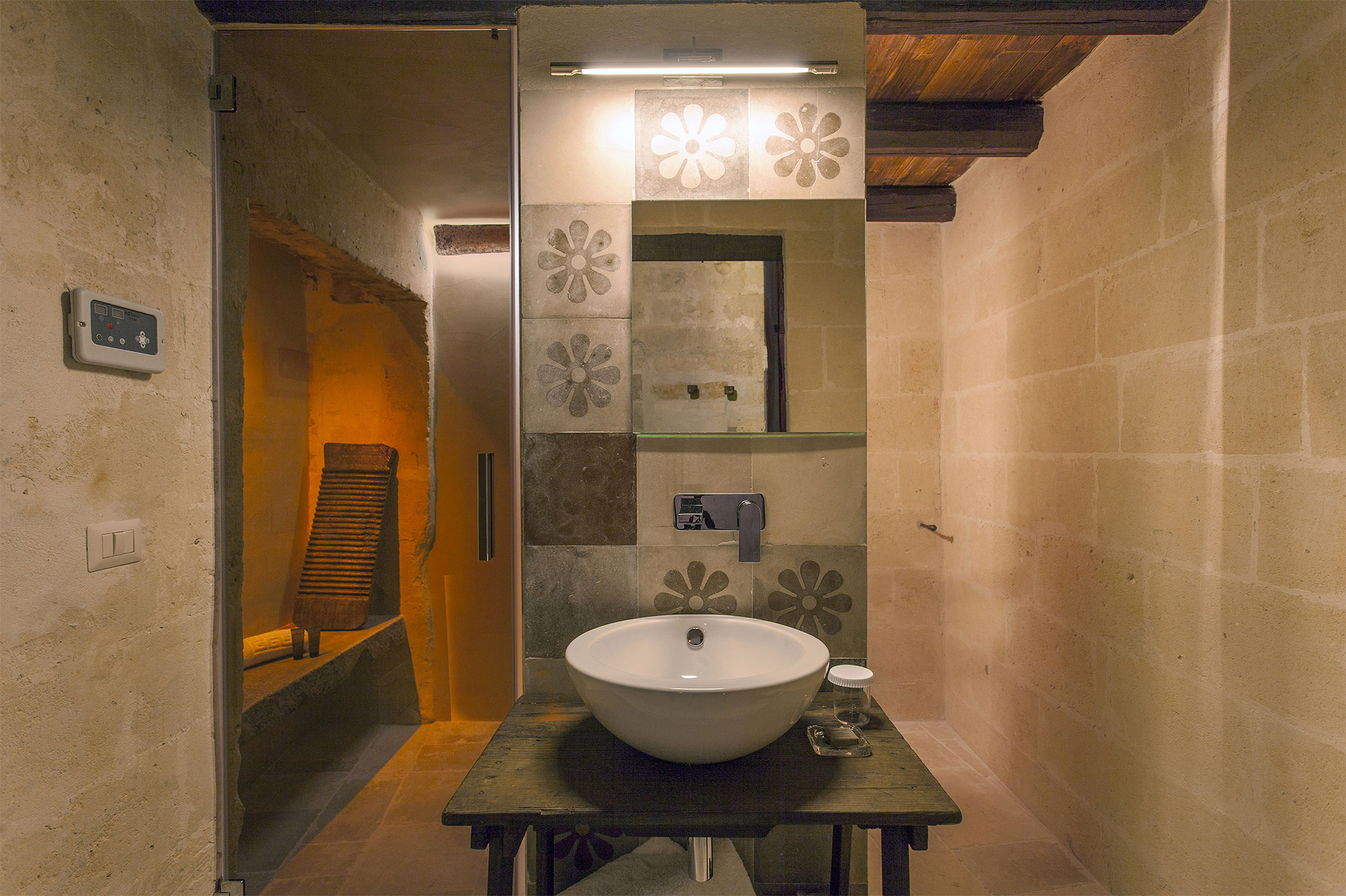 Archi di tufo introducono alle stanze da bagno, ambienti intimi ed avvolgenti, caratterizzati da nicchie e cavità che accolgono ampie vasche da bagno e docce in pietra. I bagni, privi di porte, si affacciano direttamente nella zona living. I rivestimenti delle pareti in tufo, su cui poggiano i sanitari, e delle vasche in muratura sono in lastre di pietra calcarea, cosiddetta Mazzaro. Estratto nelle cave della vicina Puglia, il Mazzaro possiede una colorazione simile a quella del tufo. La terra, la chianca, il colore naturale della pietra diventano parete, soffitto e seduta.