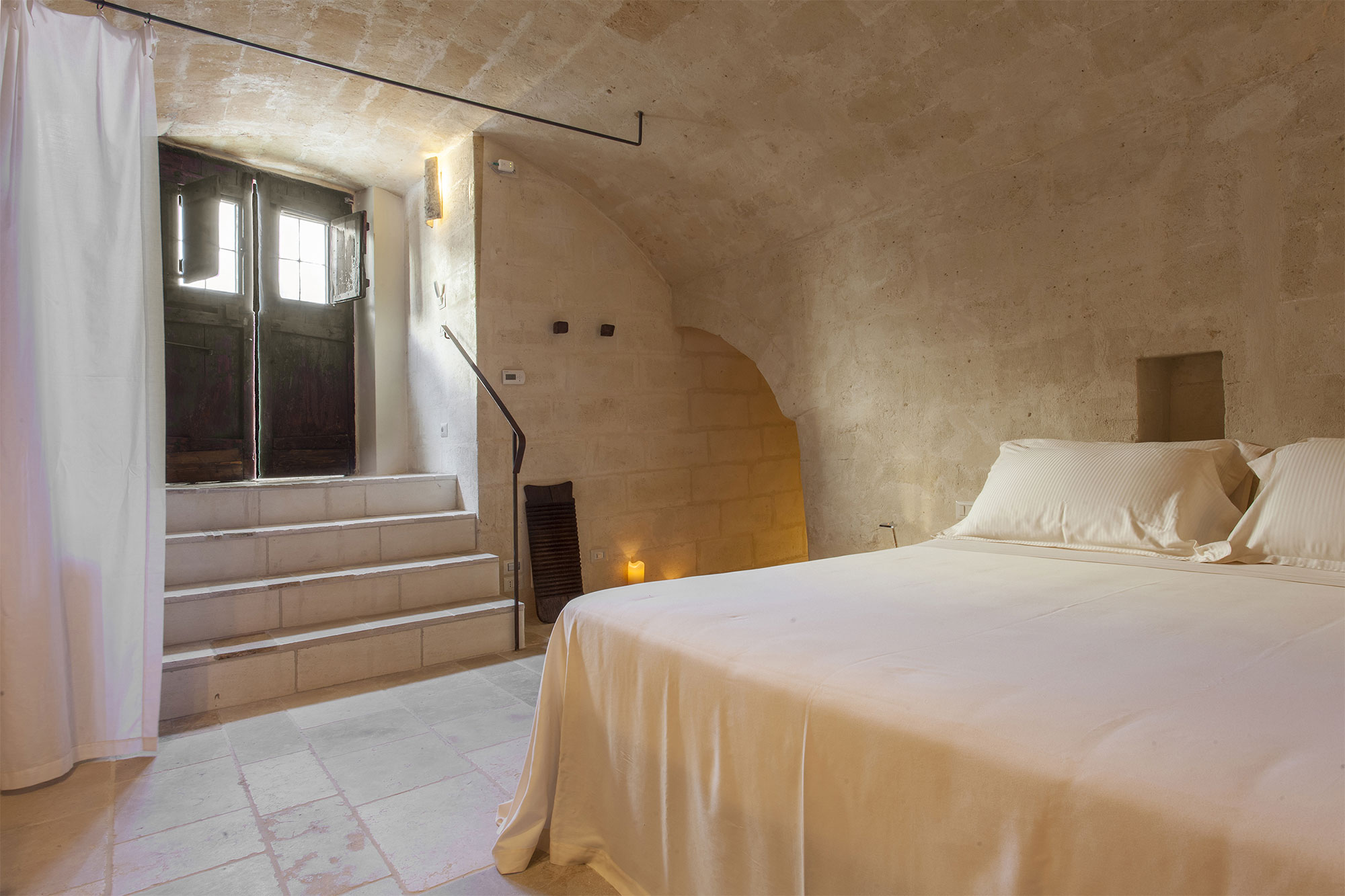 Una luce intensa filtra dalle porte d’ingresso realizzate in ferro o in legno, sapientemente lavorate a mano, che attraverso le chiare tende di lino invade il primo ambiente di ogni camera destinato a salotto e area relax. Gli ambienti successivi, quelli più privati, scavati nella roccia, sono invece illuminati da piccole finestre poste sulle volte, cosiddette “bocche di lupo”le quali creano fasci di luce direzionati, alternati ad ampie zone di ombra intime e suggestive.
