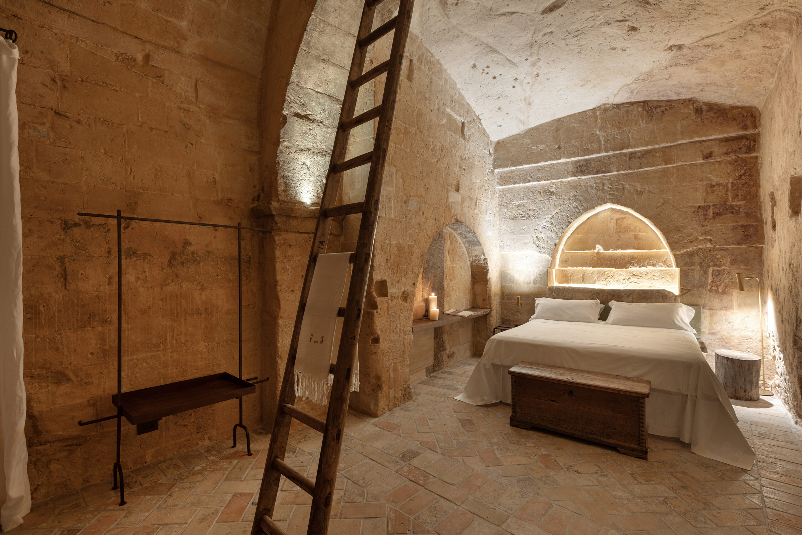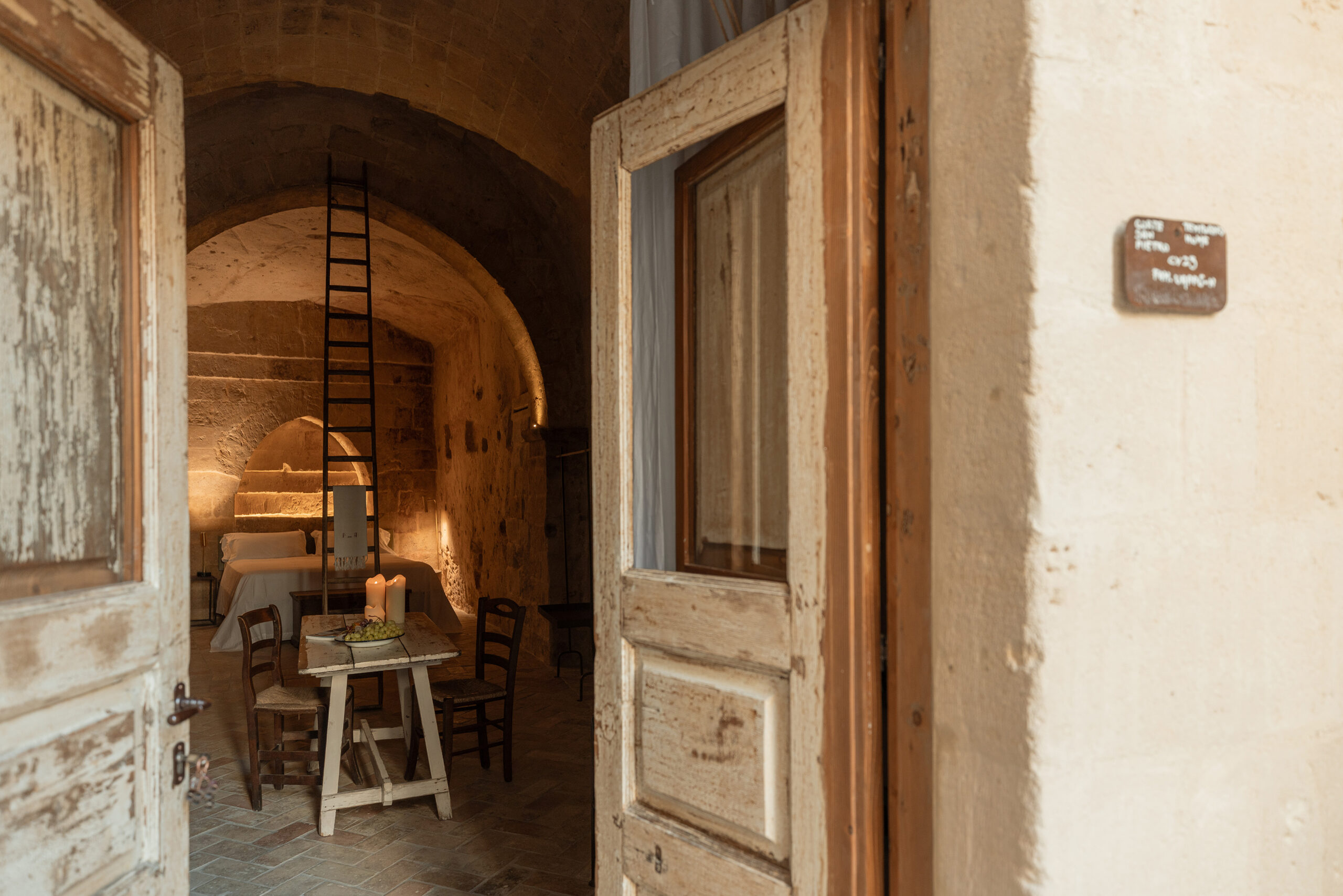La luce intensa filtra attraverso le porte originali e le tende di lino, mentre le piccole finestre bocche di lupo illuminano con grazia gli ambienti scavati nella roccia. Gli elementi di arredo, tutti di recupero, sono testimoni di un’autenticità antica.