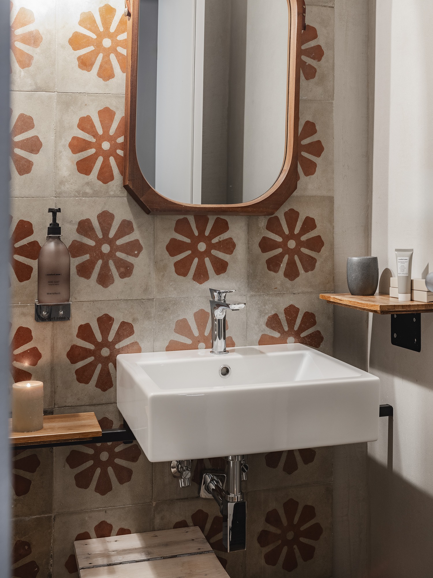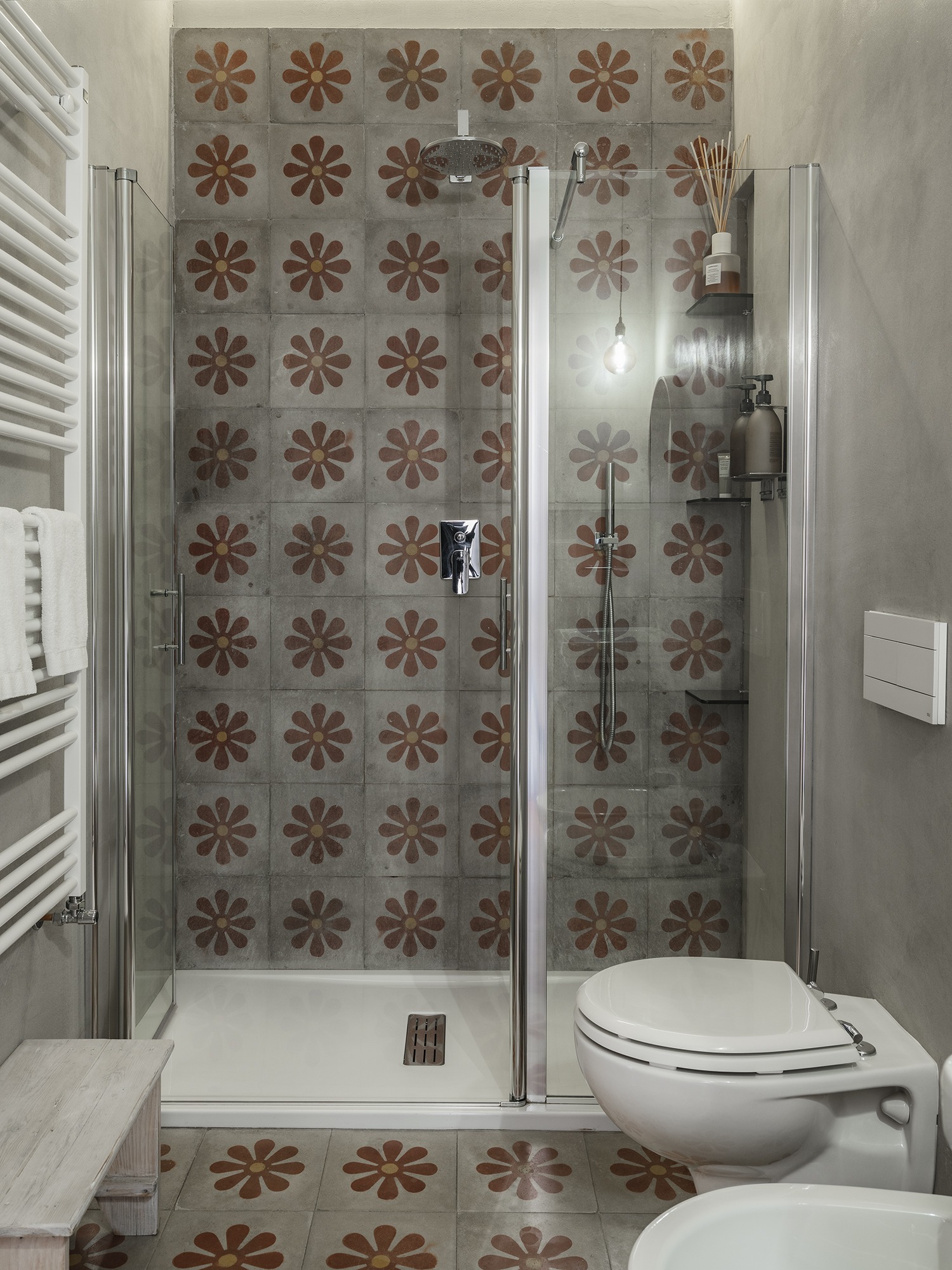 Le marmette in cemento originarie, ritrovate durante i lavori di ristrutturazione, sono state ripulite e riutilizzate nei bagni come pavimentazione e come rivestimento insieme ad una discreta resina cementizia grigia, scelta per uniformare il lavoro di ristrutturazione. Le marmette in cemento decorato, gli sgabelli di legno restaurati e gli specchi vintage, rendono gli interni dei bagni caldi ed accoglienti.