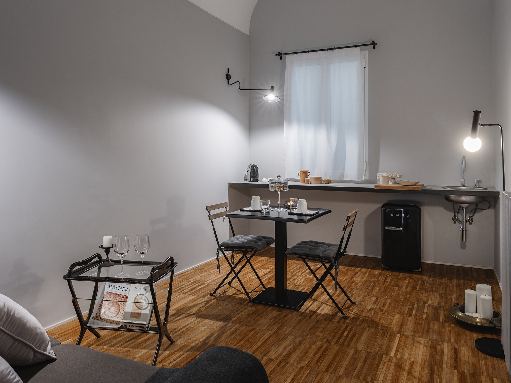 La cucina è ricavata su un ripiano in ferro e cemento in cui un piccolo lavello, un bollitore e un mini frigo Smeg assicurano, in ogni momento, la possibilità di gustare un caffe, un tè o un drink a due in un un’atmosfera morbida ed elegante.