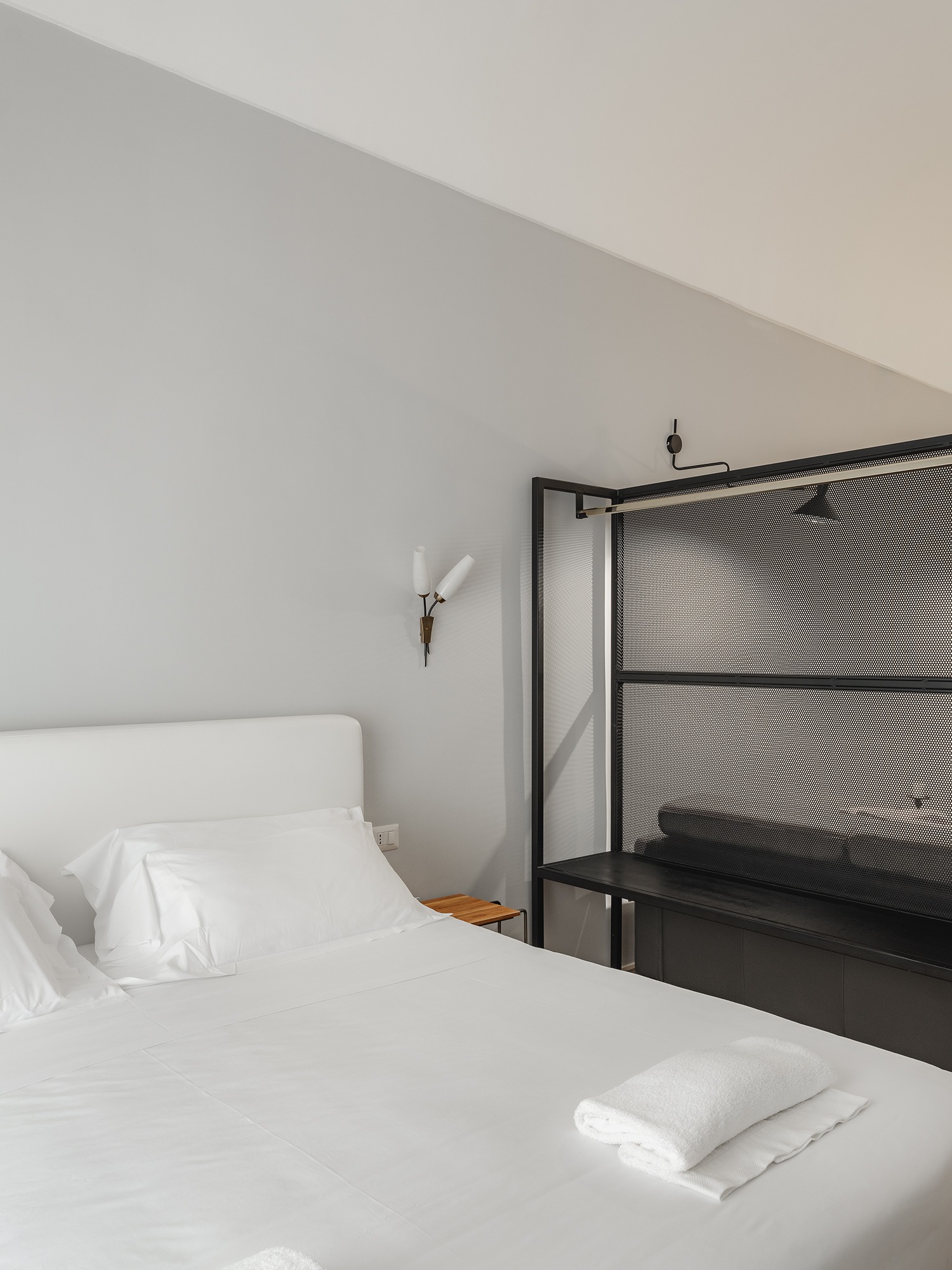 Così in un appartamento, la zona giorno e la zona notte sono separate da una struttura leggera in lamiera forata; nell’altro, da un volume centrale in muratura che accoglie la doccia e l’angolo spogliatoio.