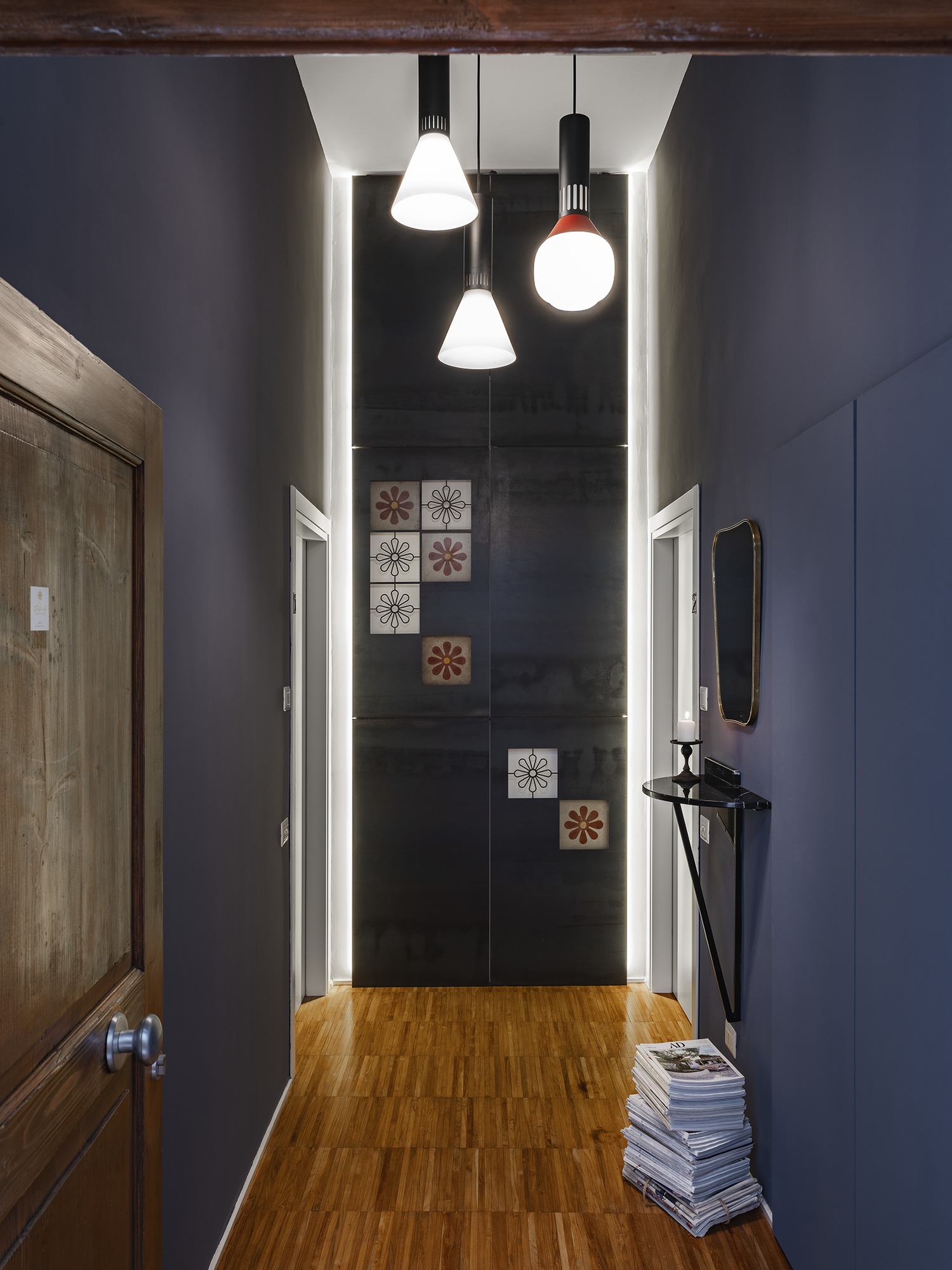 L’ingresso della residenza, contraddistinto dal colore blu delle pareti e da lampadari vintage, è arricchito da un muro rivestito di fogli di lamiera intagliata, attraverso cui la luce dei led e le cementine antiche decorate di rosso riaffiorano in diverse forme. Sempre nell’ingresso, uno specchio ovale in ottone posto su un tavolino in marmo e ferro di chiara ispirazione vintage riflette il gioco dei cromatismi dato dal blu delle pareti, dal nero del ferro, dal rosso delle cementine.