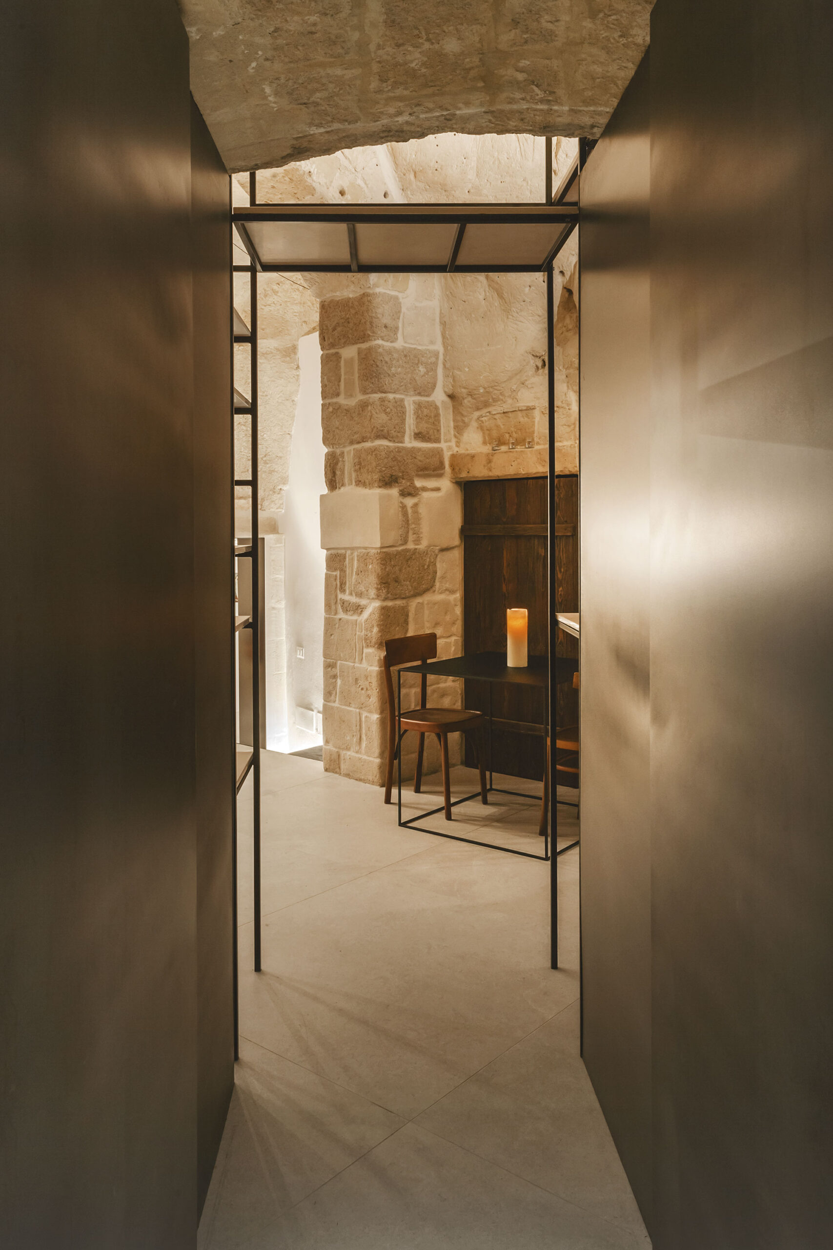 I pavimenti in pietra, le pareti bianche e le volte in tufo sono un perfetto sfondo neutro ai tavoli, alle lampade, agli accessori, agli arredi, neri come l’inchiostro su uno schizzo di progetto. La coerenza è data dalle forme essenziali, dai colori neutri e naturali della pietra e del ferro: un’ osmosi di pochi elementi ben disegnati e inseriti col giusto equilibrio tra forma e materia.
