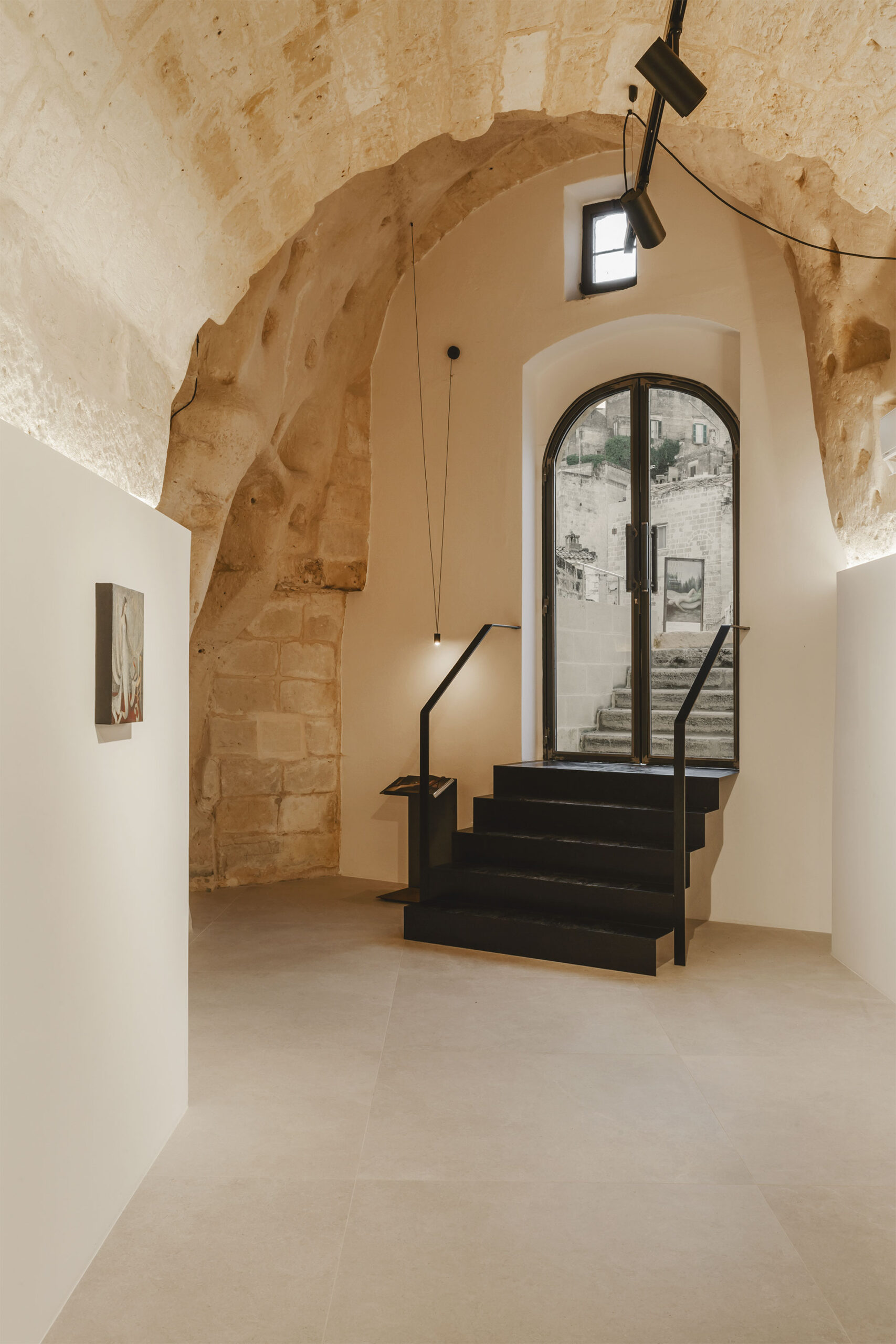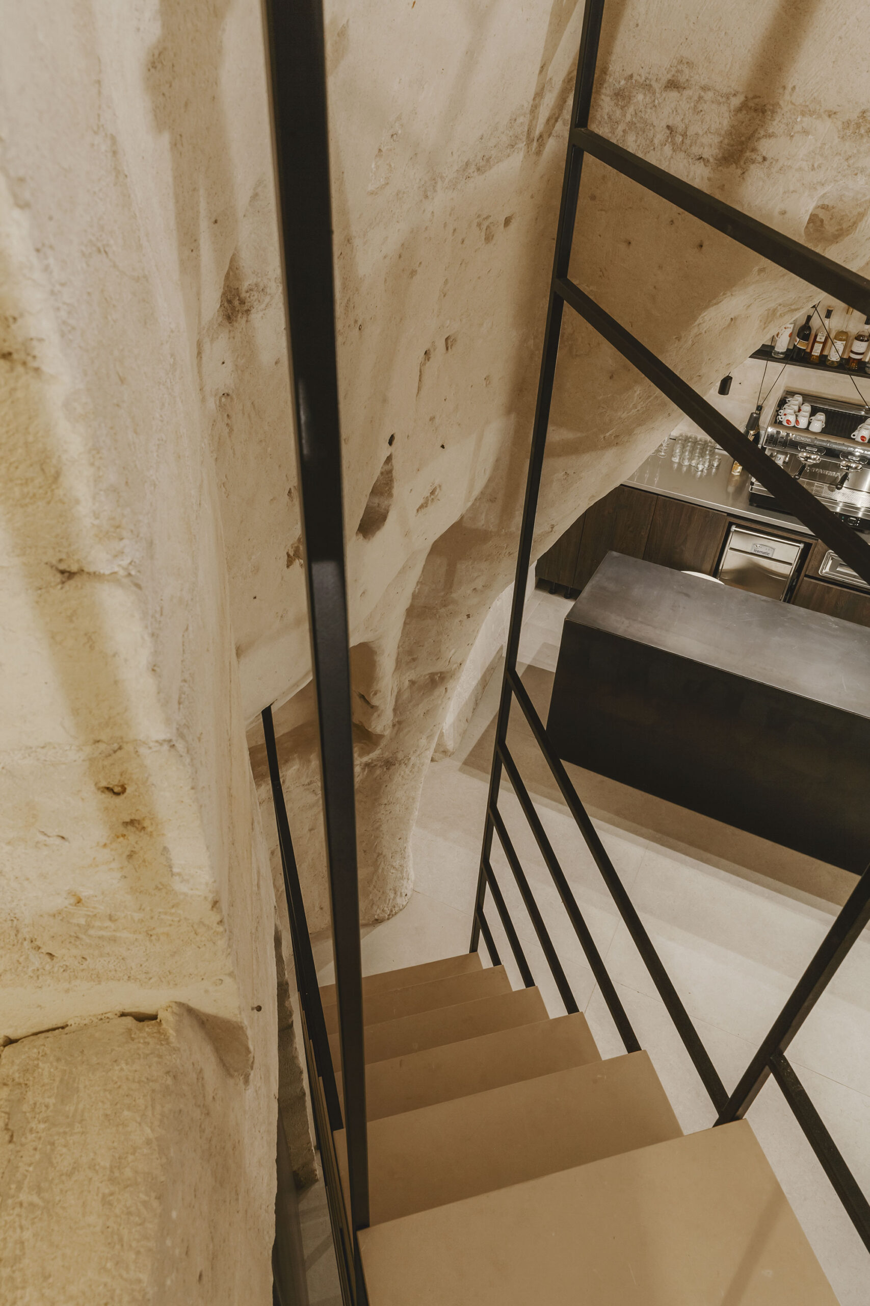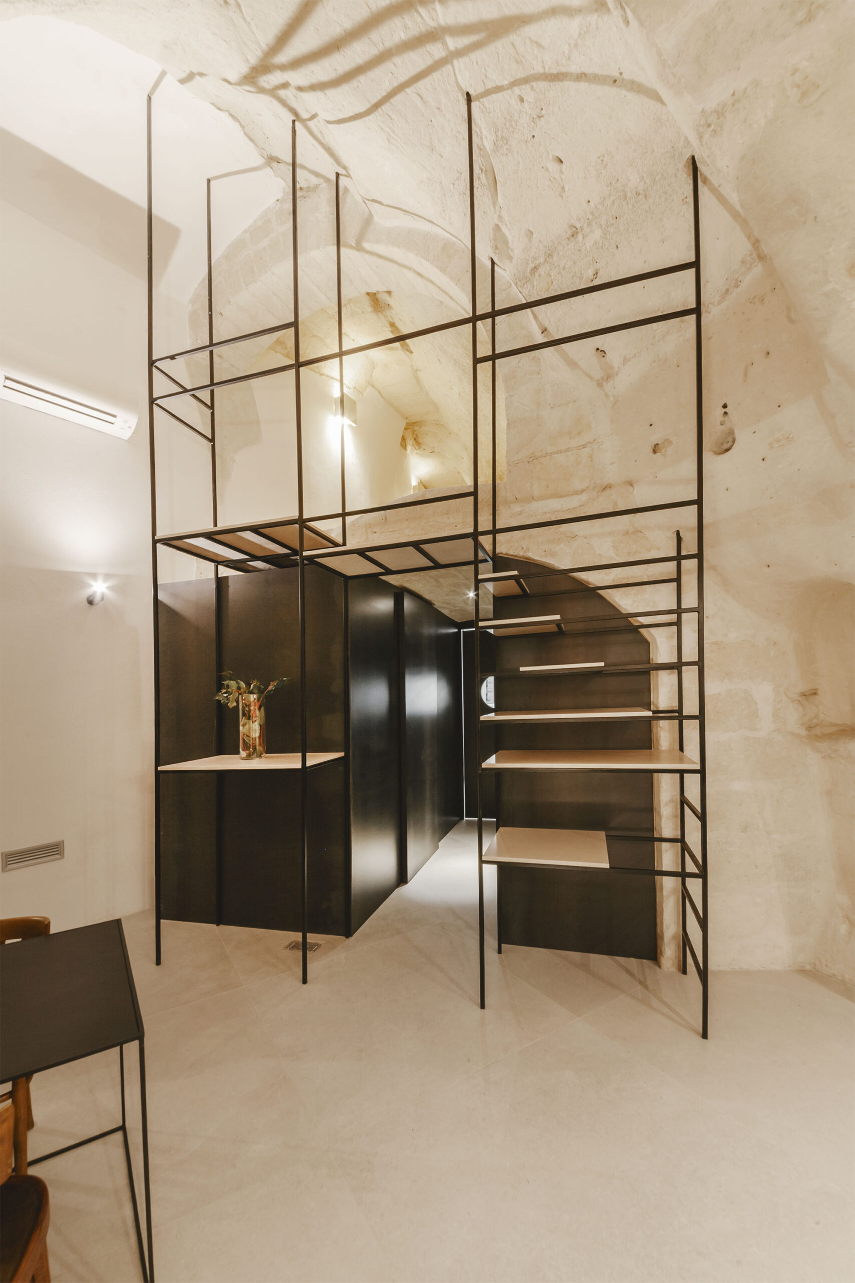 L’idea è stata quella di giocare con una doppia anima del progetto: la leggerezza dei fogli di lamiera e la solidità, la pienezza delle strutture in tufo. Gli elementi nuovi, estranei alla struttura originaria, sono stati messi in evidenza attraverso l’utilizzo di una sottile lamiera nera che sottolinea il disegno delle porte, dei tramezzi, delle scale, delle scaffalature e che avvolge e rimarca l’intero vano monocromo posto tra i due ambienti principali: la caffetteria e il laboratorio d’arte. La separazione tra i due ambienti è stata enfatizzata oltreché dalla soluzione delle pareti in lamiera anche dal salto di quota.