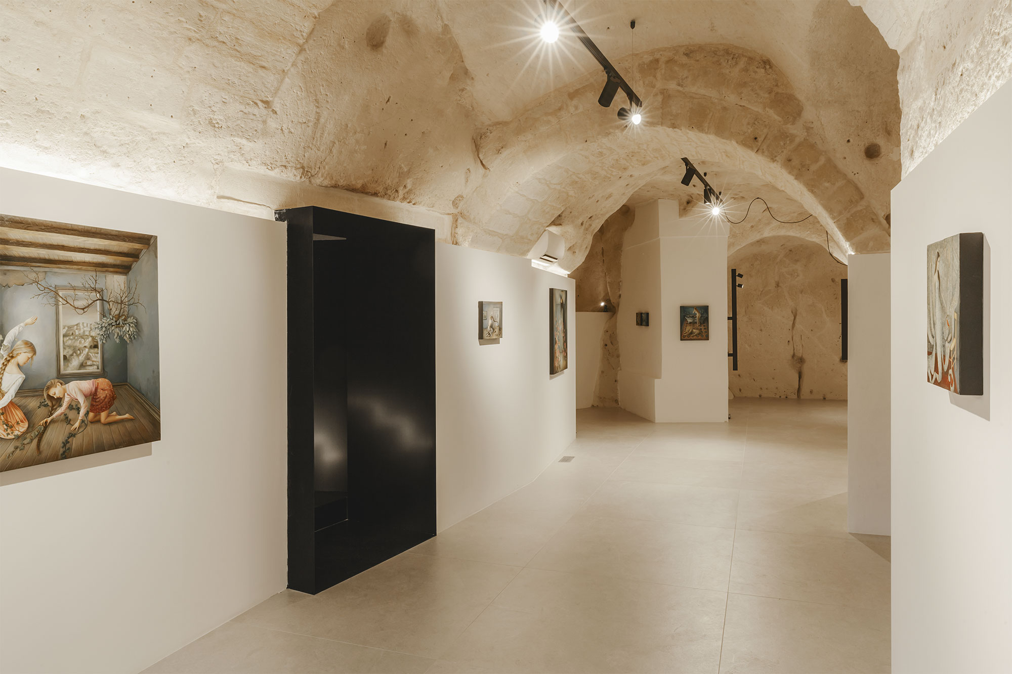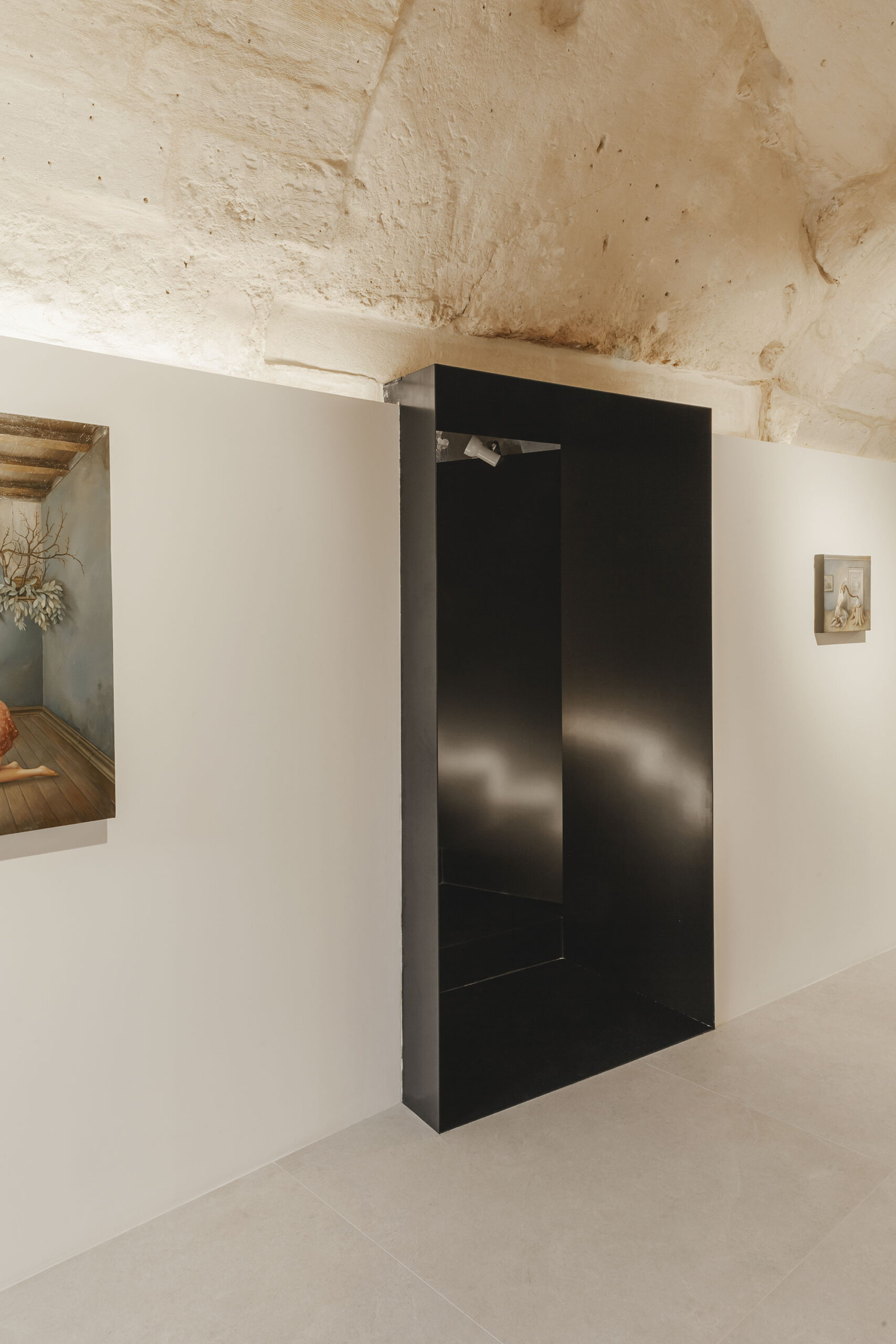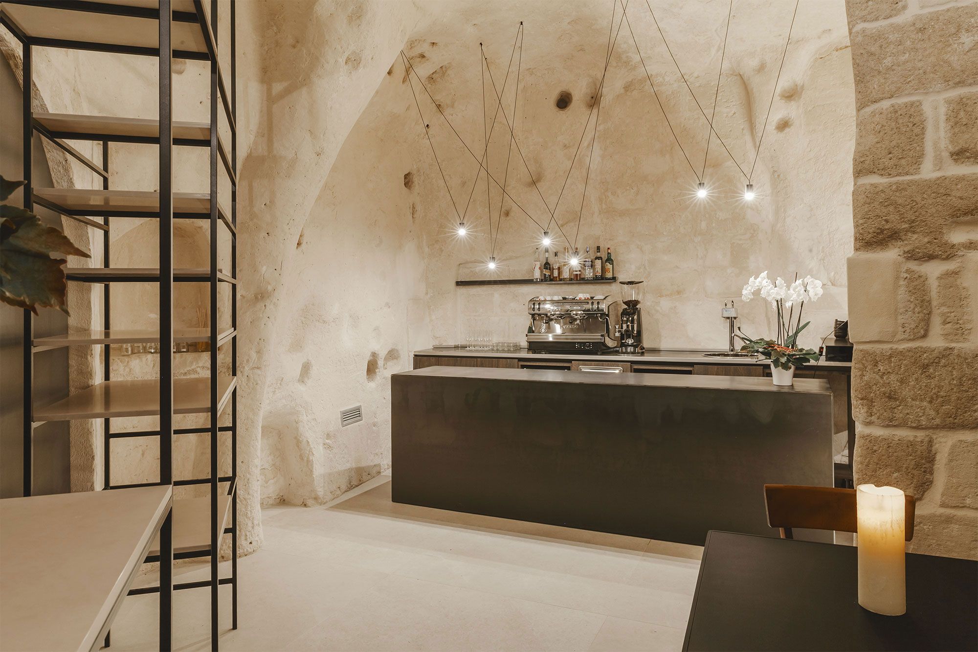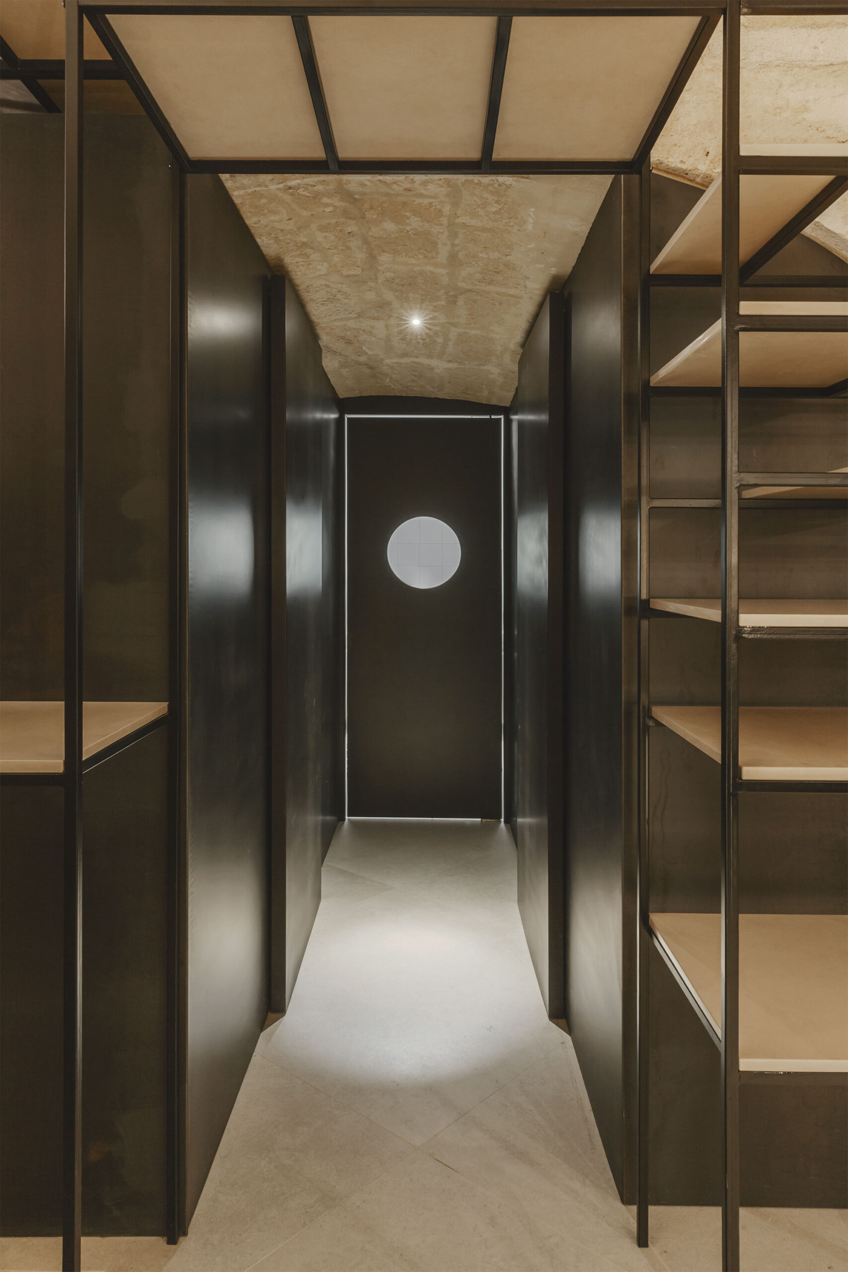L’idea è stata quella di giocare con una doppia anima del progetto: la leggerezza dei fogli di lamiera e la solidità, la pienezza delle strutture in tufo. Gli elementi nuovi, estranei alla struttura originaria, sono stati messi in evidenza attraverso l’utilizzo di una sottile lamiera nera che sottolinea il disegno delle porte, dei tramezzi, delle scale, delle scaffalature e che avvolge e rimarca l’intero vano monocromo posto tra i due ambienti principali: la caffetteria e il laboratorio d’arte. La separazione tra i due ambienti è stata enfatizzata oltreché dalla soluzione delle pareti in lamiera anche dal salto di quota.